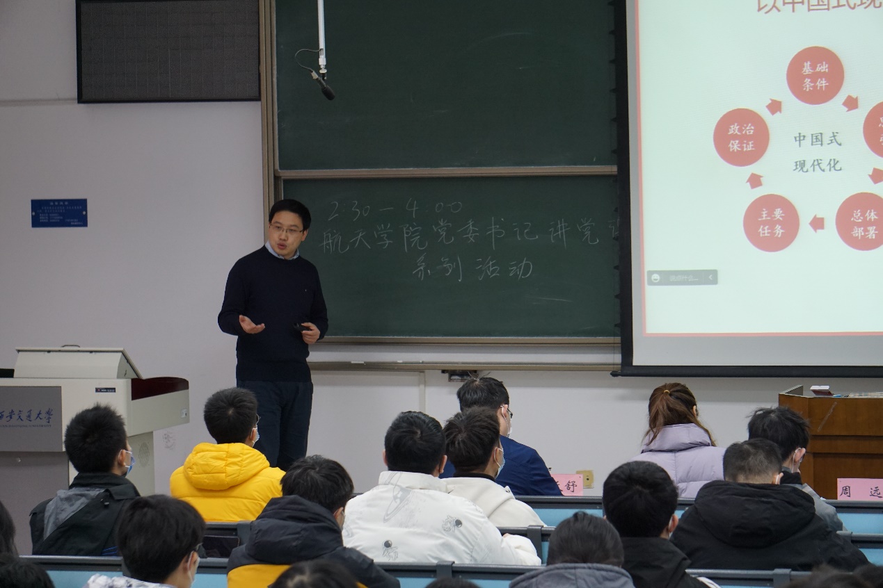 11月30日,应文治书院“心怀国之大者——党委书记讲党课”系列活动邀请,航天学院党委书记周远讲授“礼赞新时代,奋进新征程”主题党课。文治书院党总支书记、院务主任王琦,航天学院党委秘书韩阳,文治书院党总支委员、辅导员孟建芳,航天学院组织员陆天舒出席活动。按照疫情防控要求,活动采取线上线下相结合的方式进行。本次活动由刘欣淼同学主持,航天学院全体本科生党员和班级团干部参加学习。