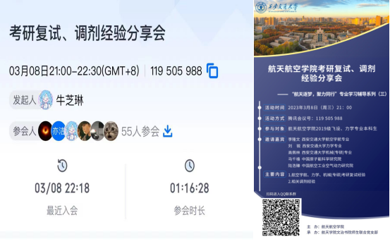 主办,航天学院文治书院师生联合党支部承办,主要围绕学生考研复试、调剂经验分享展开。活动由党支部书记牛芝琳主持,邀请交大往届飞设、力学专业方向考研上岸的5名优秀学子作经验分享,50余名学院毕业班考研学生线上参加交流。