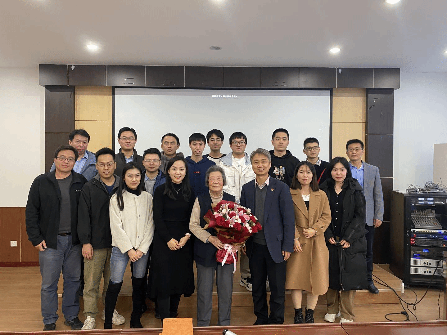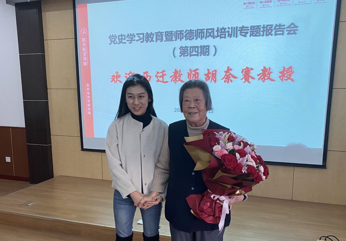 报告伊始,学院学生入党发展对象董颖璇同学代表全体师生向胡奈赛教授献花,表达学院师生对胡奈赛老师等一批西迁先贤的崇高敬意。