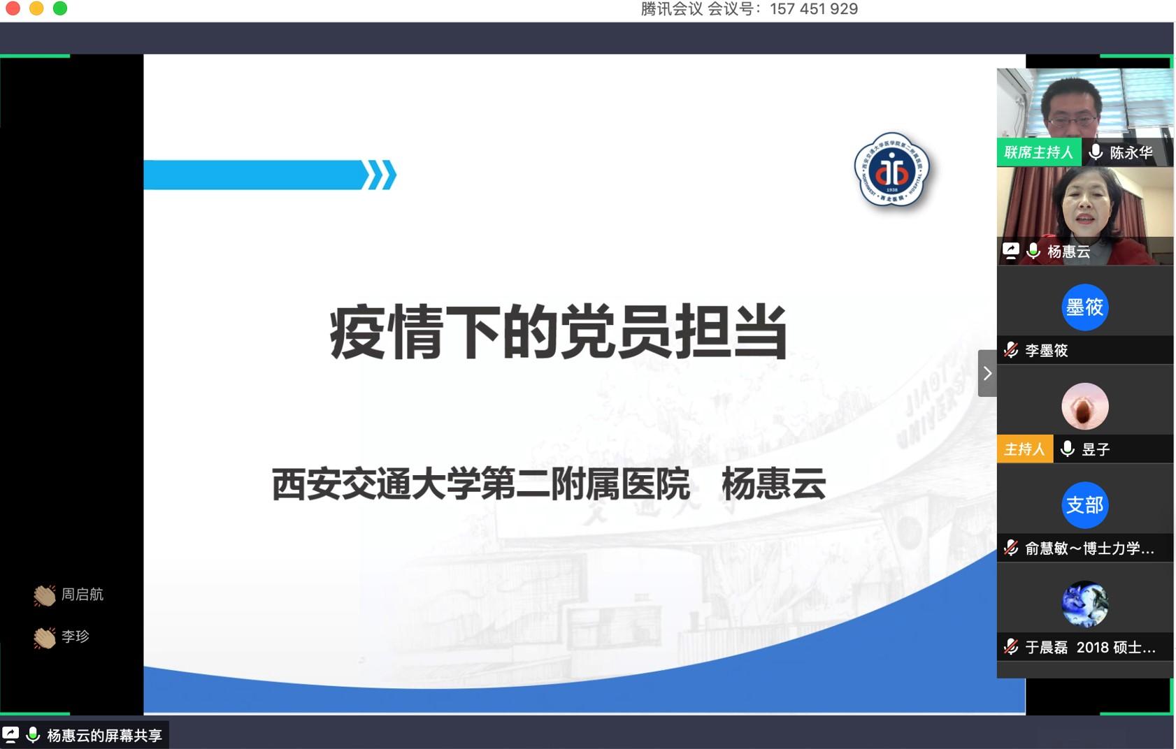 杨主任从坚守阵地和征战武汉两个部分展开,介绍了医护人员在抗击新冠肺炎疫情的点滴感人故事。首先,杨主任回顾了西安交大二附院所有医护人员在抗击疫情时所付出的努力,二附院作为陕西首批收治新冠肺炎定点医院之一,全体医护人员从发热病房的快速运行再到陕西首例新冠肺炎产妇成功分娩,全力以赴救治病患,有效控制病患病情的发展。接着,面对新冠肺炎疫情发展,二附院医护人员身体力行,火速组建援鄂医疗队前往武汉抗疫一线。杨惠云老师谈到,组建援鄂医疗队虽然时间紧、任务重,但全体医护人员都表现出了勇挑重担、不畏艰难的精神,主动请战出征。有些踊跃报名的医护人员家中小孩年幼,却仍然勇往直前,展现了“舍小家、顾大家”的大无畏精神。在到达武汉抗疫一线后,杨主任与同事迅速接管了同济医院中法新城院区的一个重症病区。在治疗过程中面对遇到的诸多困难,交大援鄂医疗队依然以扎实优异的医疗技术和勇往直前的精神交出了一分满意的答卷。谈及党员同志冲在了战“疫”的第一线,杨老师引用毛主席的一句“支部建立在连上”,称“我们现在就是‘支部建立在医疗队’上”,言语间饱含身为一名共产党员为人民服务的责任与担当。在谈及与新冠肺炎患者相处的点滴时,杨老师的言语中又多了一分温情。“被患者需要也是一种快乐。”以杨老师为代表的交大援鄂医疗队员始终秉持做有温度的医护人员这一信念。她们不但积极解决患者的日常生活问题,还与心情焦躁的患者进行交流,给他们一个拥抱,还为患者制作千纸鹤和香囊,从而有效地减缓了他们对病情的恐惧心理。