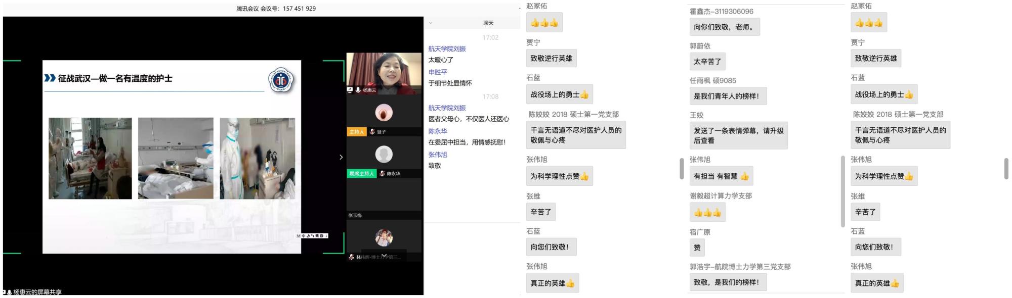 杨主任的报告引发师生们热烈的讨论,师生们纷纷表达了他们的对逆行英雄的事迹的感动,同时也对他们为全国人民的生命安全负重前行的壮举表达由衷的感谢。申胜平院长在报告的评论区留言“于细节处显情怀”,空天系主任刘振留言“医者父母心,不仅医人还医心”。博1611班谢峰感慨道:“疫情当前,她们没有因为身后的牵挂而退缩,相反她们义无反顾的背起行囊踏上了援鄂的征程,因为国家需要他们,武汉人民需要他们,正如60年前西迁前辈们支援大西北,建设国家,因为在他们的心中牢记着“党让他们去哪里,他们背起行囊就去哪里”。在新时代“西迁精神”的熏陶下,交大人在这次疫情面前没有畏缩,没有选择安逸,而是第一时间听从党和国家的号召,奔赴武汉抗疫前线。她们是年轻的战士,当拿起自己手中的武器与病毒做斗争时愈战愈勇,是真正的勇士与英雄。”
