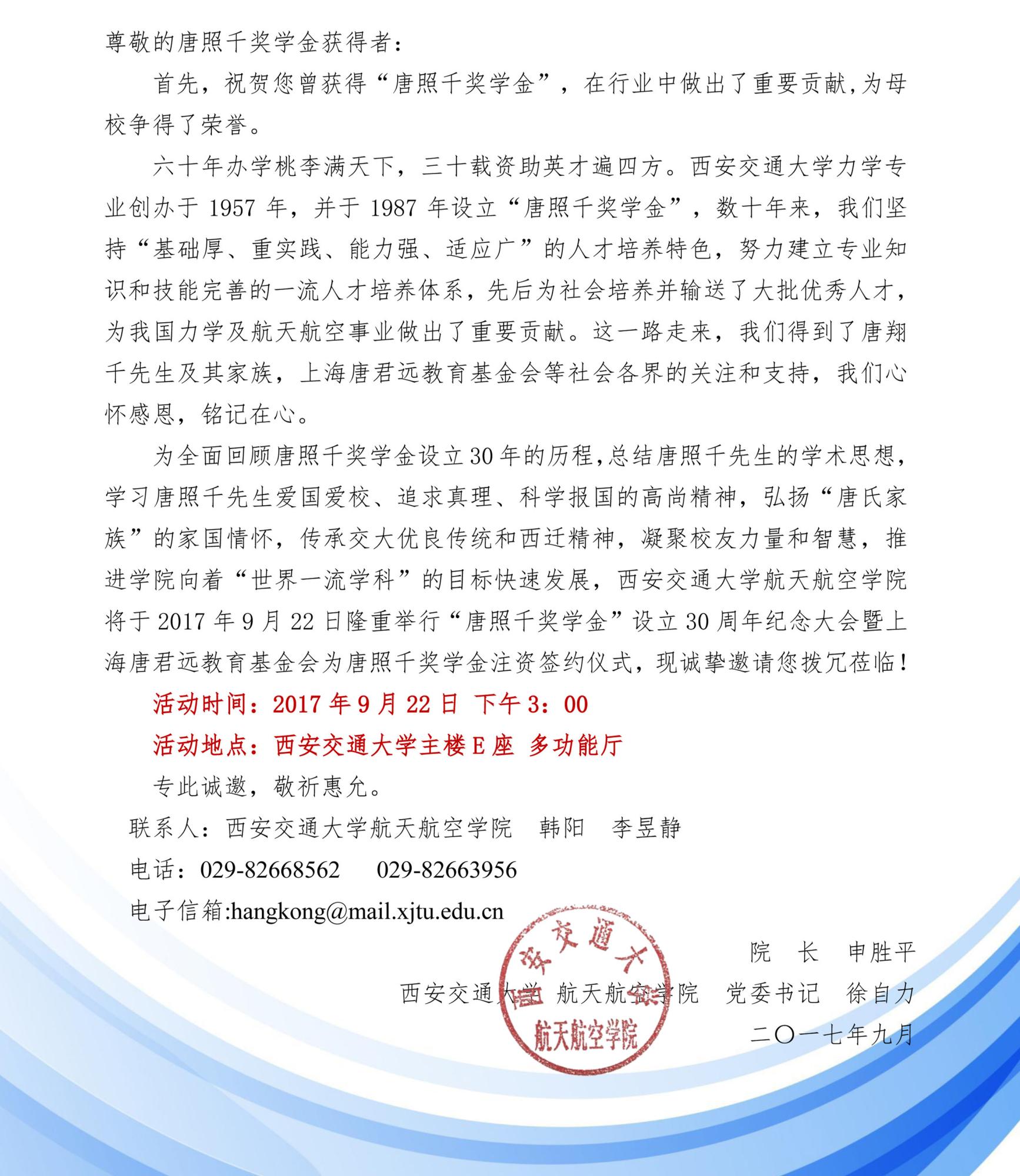 “唐照千奖学金”设立30周年纪念大会邀请函