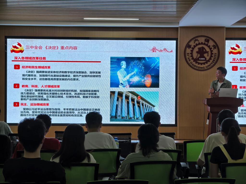随后,文佳豪分享关于习近平总书记在党的二十届三中全会第二次全体会议上讲话的理解感悟,带领大家深入分析了讲话的核心要义。文佳豪同学从深入学习领会全会精神、切实抓好决议部署的贯彻落实和扎实做好下半年工作三个部分,结合当前社会发展背景和个人学习工作实际,分析了全面深化改革的重要性,以及如何落实讲话精神的必要性。