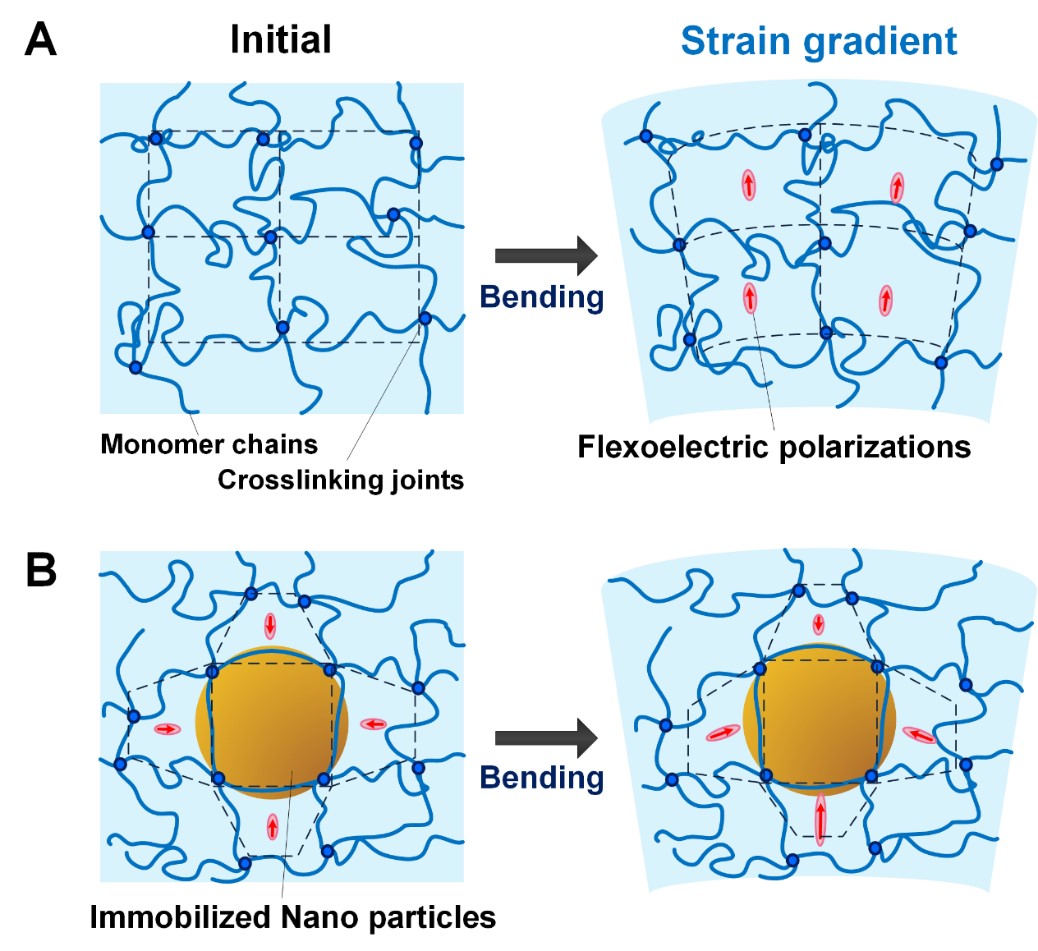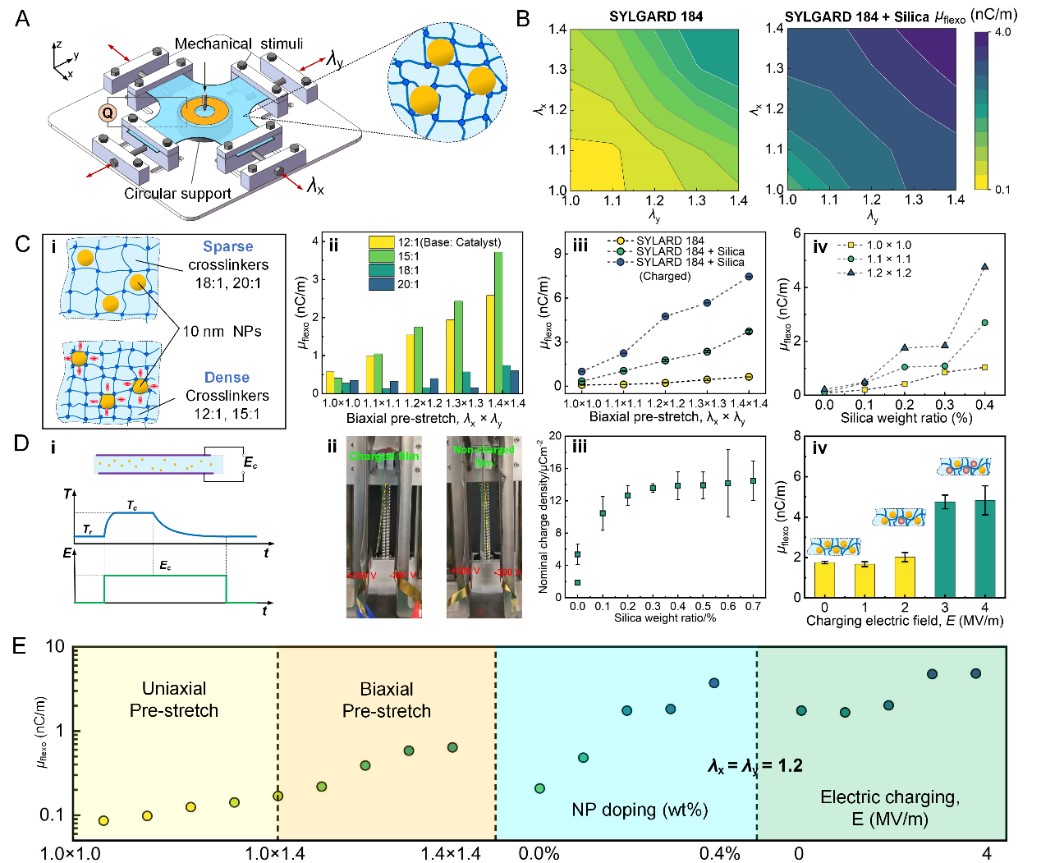 徐明龙教授团队以其在挠曲电效应及其调控方法的研究积累为基础,设计了“三级跳”式的巨大类压电效应实施方案:即采用具有巨大弹性变形范围的介电弹性体非压电材料,首先对其进行宏观尺度的双轴预拉伸,以改变材料微观尺度的等效电荷中心非对称性、并通过调控交联密度进一步提升挠曲电系数水平;再植入纳米驻极体颗粒并利用其与交联网络尺寸匹配的手段预设局部的微观应变梯度;最后将净电荷“注入”驻极体颗粒并巧妙地利用交联网络进行颗粒的物理约束和锁止,进一步改变微观结构中正、负电荷中心位置,增强了力电耦合效率。力学设计方面,团队利用“戳”的手段在宏观尺度上构造了巨大的局部应变梯度,实现了巨大的挠曲电效应。图1为利用非压电材料的挠曲电原理调控巨大类压电效应的基本原理。图2为 “三级跳”式方法对材料挠曲电效应的提升效果。图3为巨大应变梯度的力学设计思路及类压电系数提升过程。