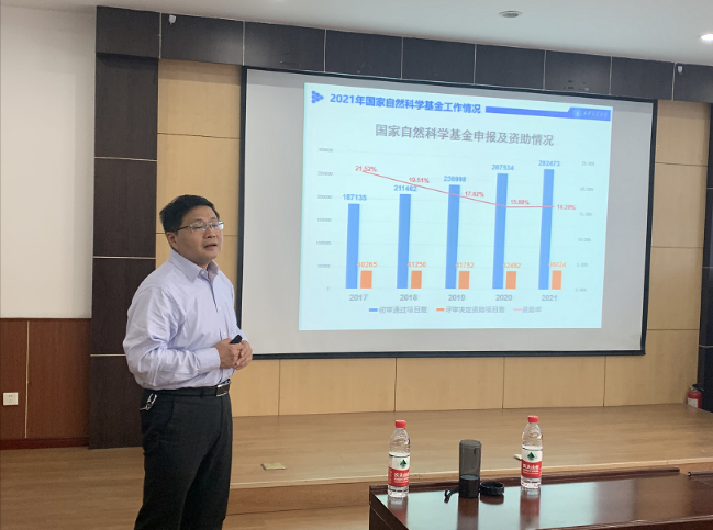 科研院刘永忠副院长做了2022年基金申请动员专题报告。他首先介绍了2021年国家自然科学基金学校、学院申请、资助情况,对学院在2021年基金资助获得的优异成绩给予了充分肯定。他为老师们梳理了“十三五”期间学院的基金资助情况,并重点对基金人才项目和联合基金项目予以了介绍。刘永忠副院长对学院基金工作提出了建议,希望学院2022年基金申报能够保持和发扬今年基金资助率上扬势头,有序组织人才类项目申报,重点策划重大、重点类项目,重视学科交叉项目申报,积极组织“教育信息科学与技术(F07)”项目和专项项目申报。