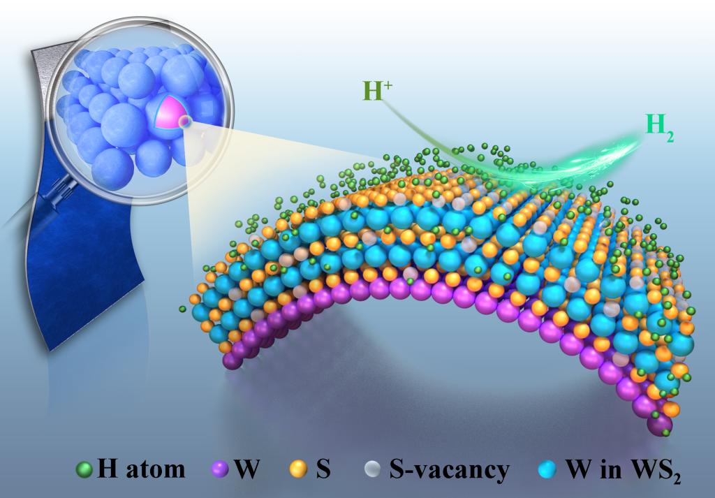 申胜平教授团队针对上述问题设计了一种钨(W)@二硫化钨(WS2)核壳型纳米球结构,揭示了该结构对于WS2电学及化学性能提升的机理,通过微结构设计使得WS2的电催化析氢性能超过了绝大多数同类材料。