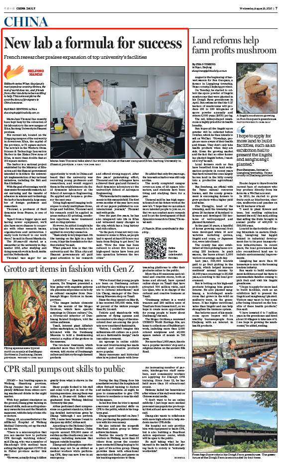 8月26日,中国日报第7版“小康路上的外国人”栏目以“New lab a formula for success”为题,报道西安交大航天学院外籍教授陶益壮的科研故事,现将全文转载如下:
