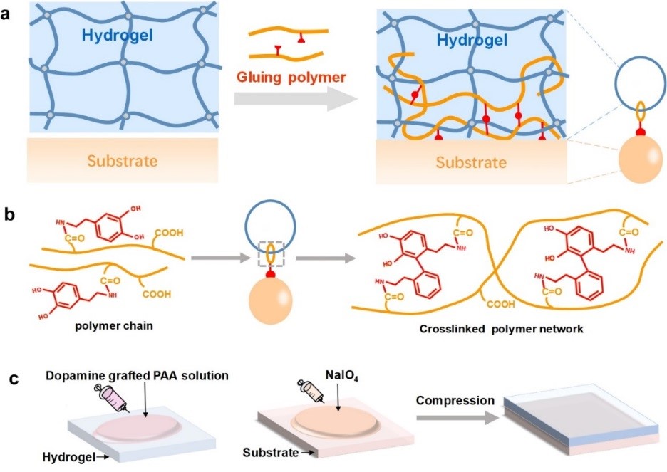软机器实验室卢同庆教授及高扬博士提出水凝胶通用粘接的概念。研究团队以聚丙烯酸接枝儿茶酚形成的长链聚合物作为胶水,简单方便地使多种水凝胶与多种材料(玻璃、金属、塑料、弹性体、生物组织)形成有效粘接。作为胶水的聚合物溶液可以扩散到水凝胶网络中,带有儿茶酚的聚合物长链在氧化剂的触发下发生交联,原位形成的聚合物网络像“分子缝线”一样与水凝胶网络拓扑缠绕在一起,同时聚合物链上的儿茶酚又可以通过各种相互作用与不同基底材料(玻璃、金属、塑料、弹性体、生物组织)键合,从而产生强韧粘接,其粘接能高达200-400J/m2。这一研究不仅为水凝胶粘接提供了一种方法,同时极大简化了柔性器件和可穿戴设备中的异质材料组装问题,并且在医学和工程应用中具有巨大的潜力。