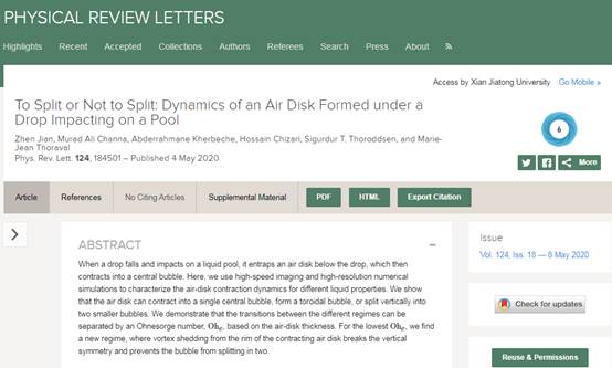 The results, titled "To Split or Not to Split: Dynamics of an Air Disk Formed under a Drop Impacting on a Pool", were published in the top journal of physics, PHYSICAL REVIEW LETTERS (impact factor: 9.227). The authors originally come from six different countries as China, Pakistan, Morocco, Iran, Iceland and France. They are: Dr. Zhen Jian, Assistant Professor from the School of Aerospace, Xi'an Jiaotong University; Murad Ali Channa, Master’s degree from the School of Aerospace, Xi'an Jiaotong University; Dr. Abderrahmane Kherbeche and Dr. Hossain Chizari, Postdoctoral researchers from the School of Aerospace, Xi'an Jiaotong University; Professor Sigurdur T. Thoroddsen from KAUST; the corresponding author is Professor Marie-Jean Thoraval, from the School of Aerospace, Xi'an Jiaotong University.