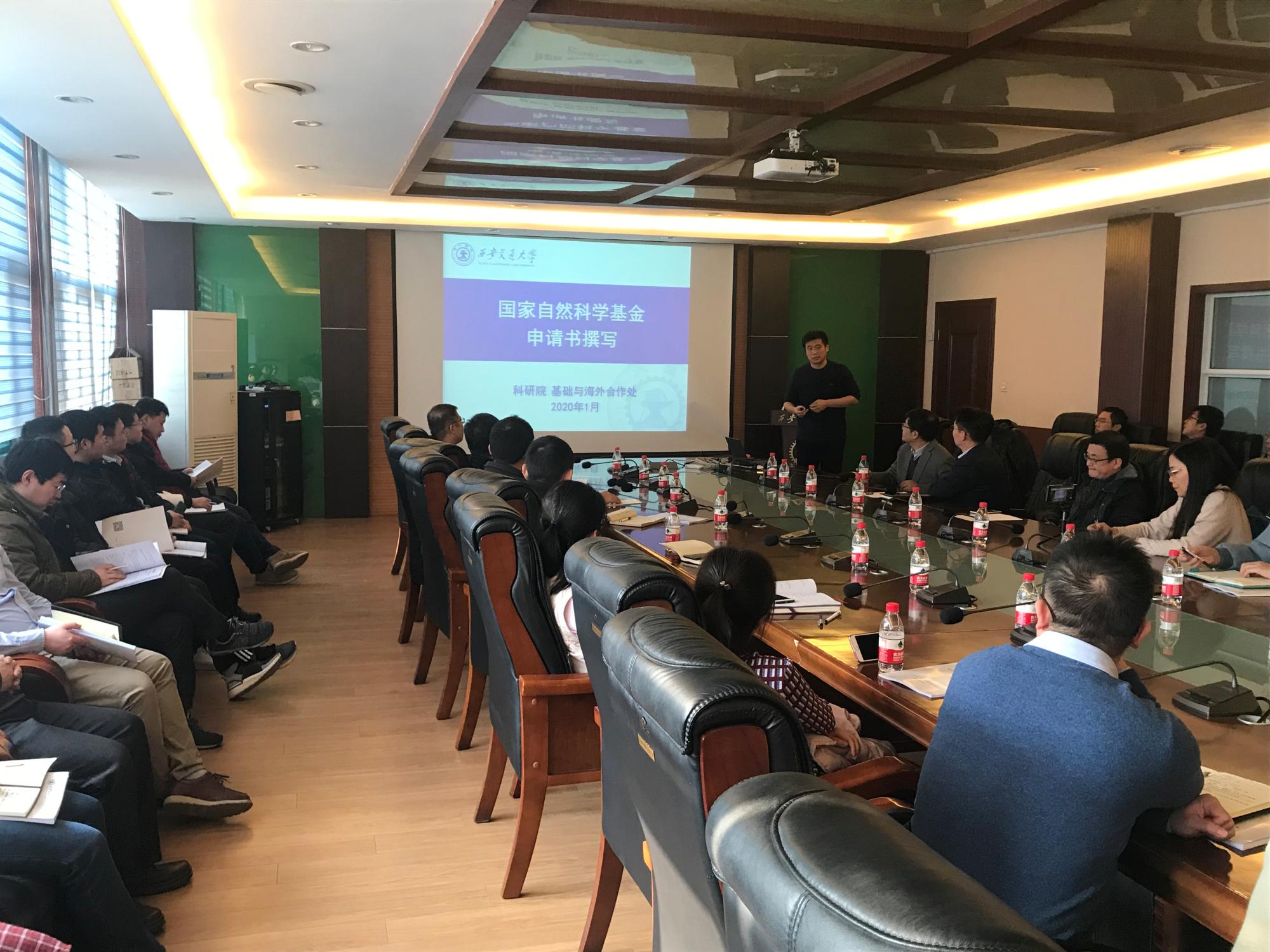 刘永忠副院长首先介绍了2019年学校和学院基金申请、资助情况及2020年基金申报新的国家政策,梳理了学院在“十三五”期间基金资助情况。肯定了学院在“十三五”期间基金资助获得的成绩,同时也指出了学校在“十四五”期间基金项目申报的努力方向,希望学院“十四五”期间,能够在创新群体、重大项目、人才项目有更大的突破。