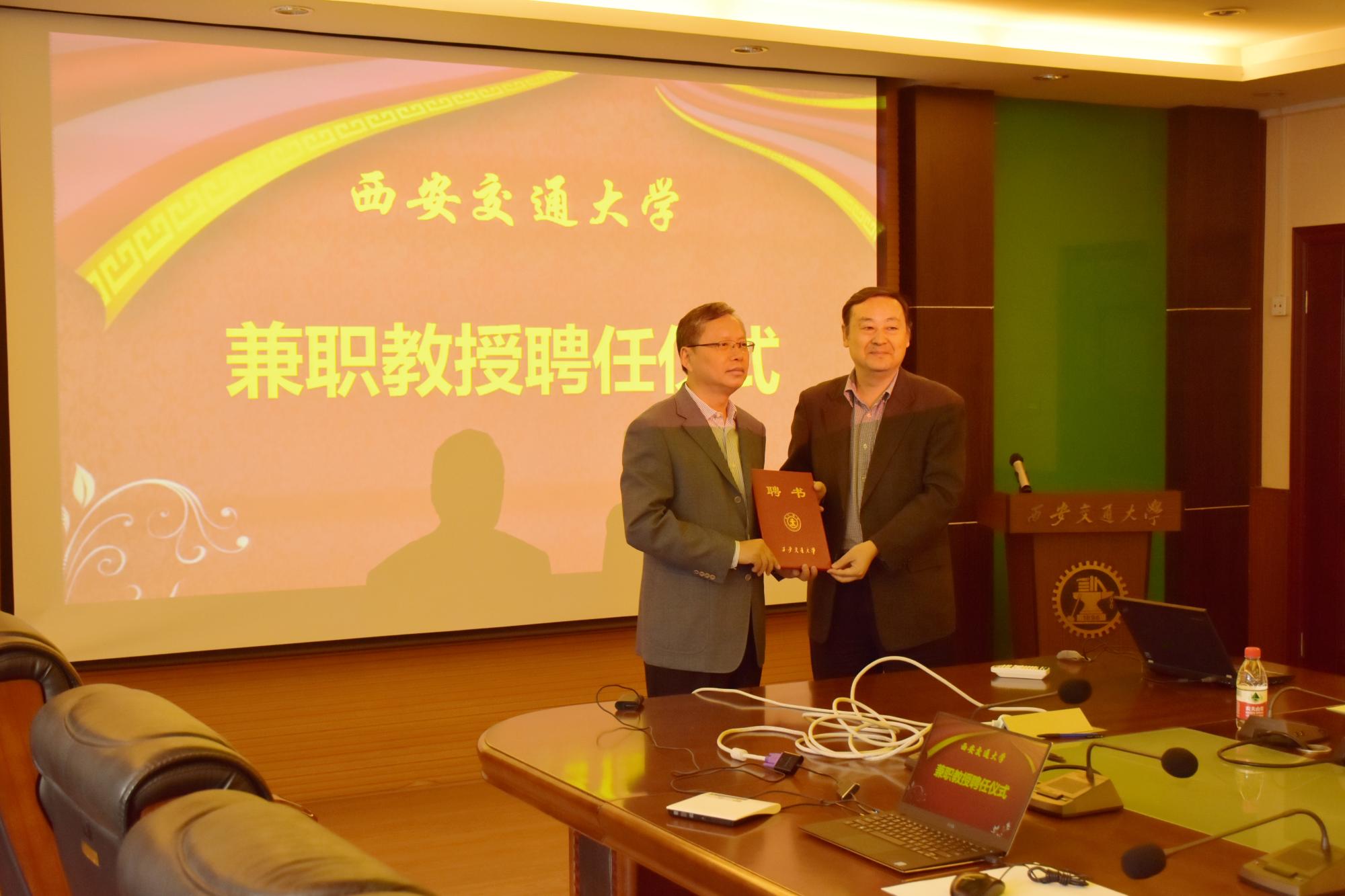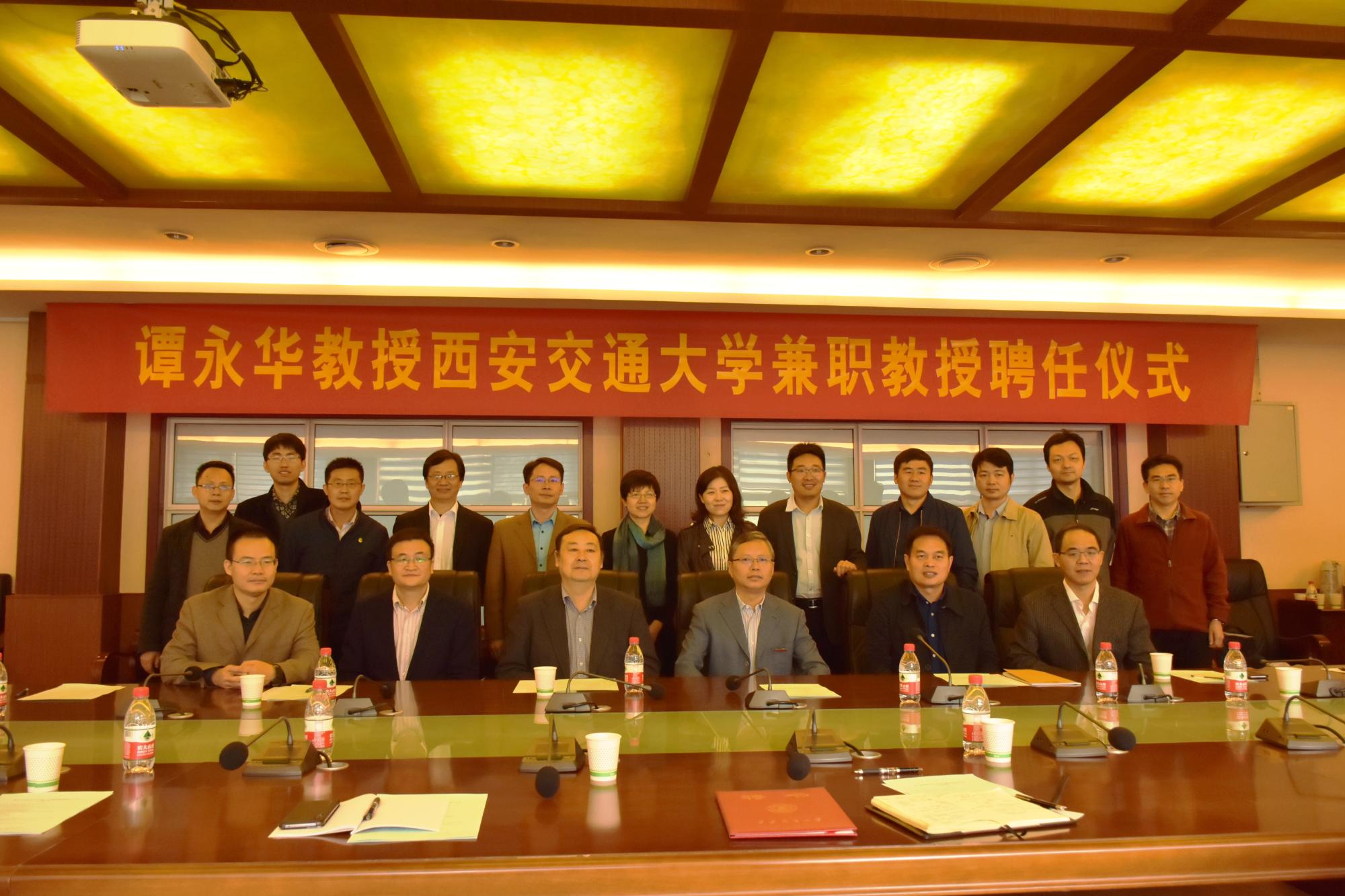 兼职教授,王铁军副校长向谭永华教授颁发聘书并为其佩戴校徽。航天科技集团六院研发部论证中心王拴虎主任、科技委办公室李晨副主任,西安交大科研院苏光辉副院长、航天学院全体院领导及空天工程系师生代表出席,航天学院申胜平院长主持聘任仪式。