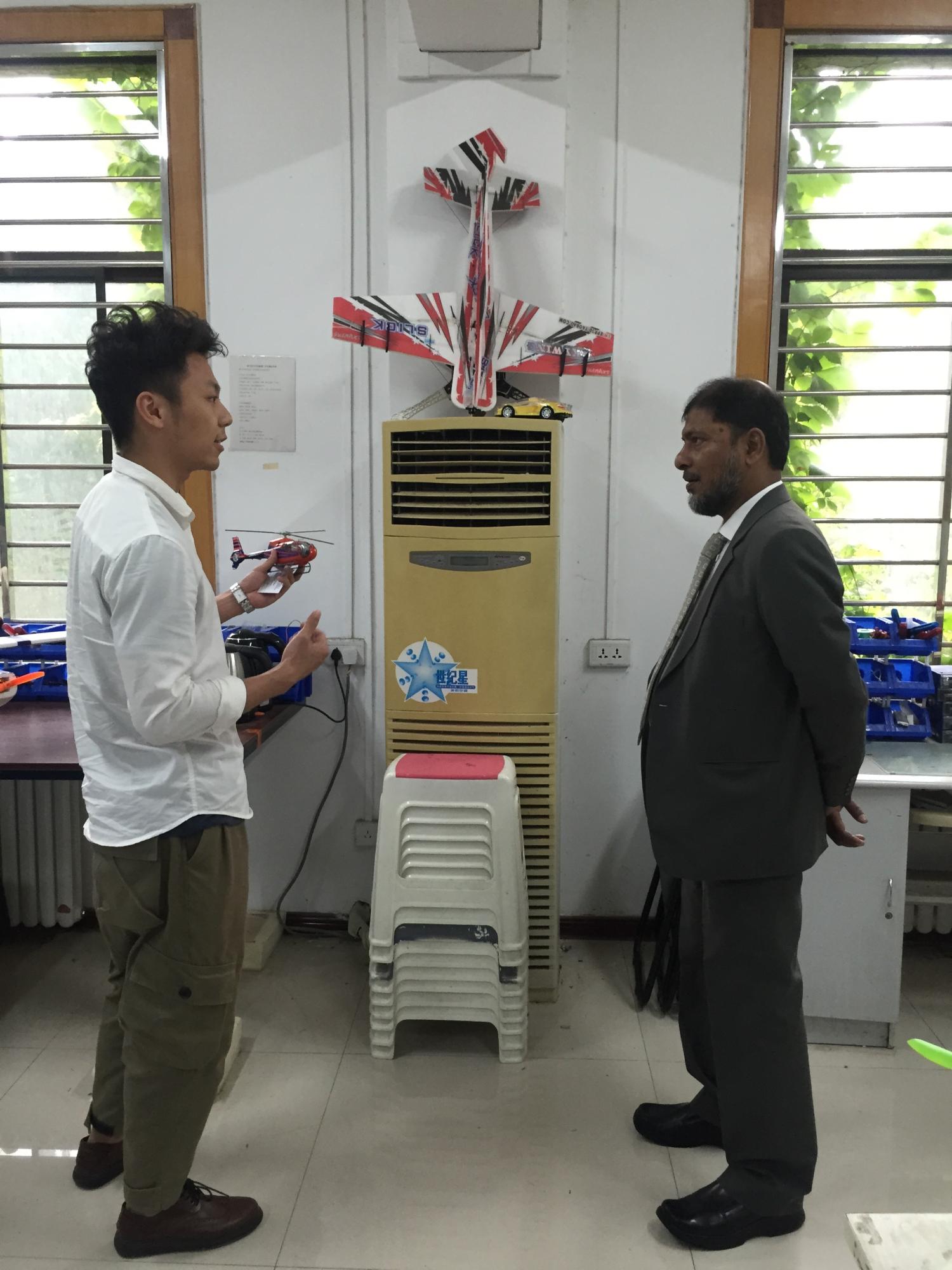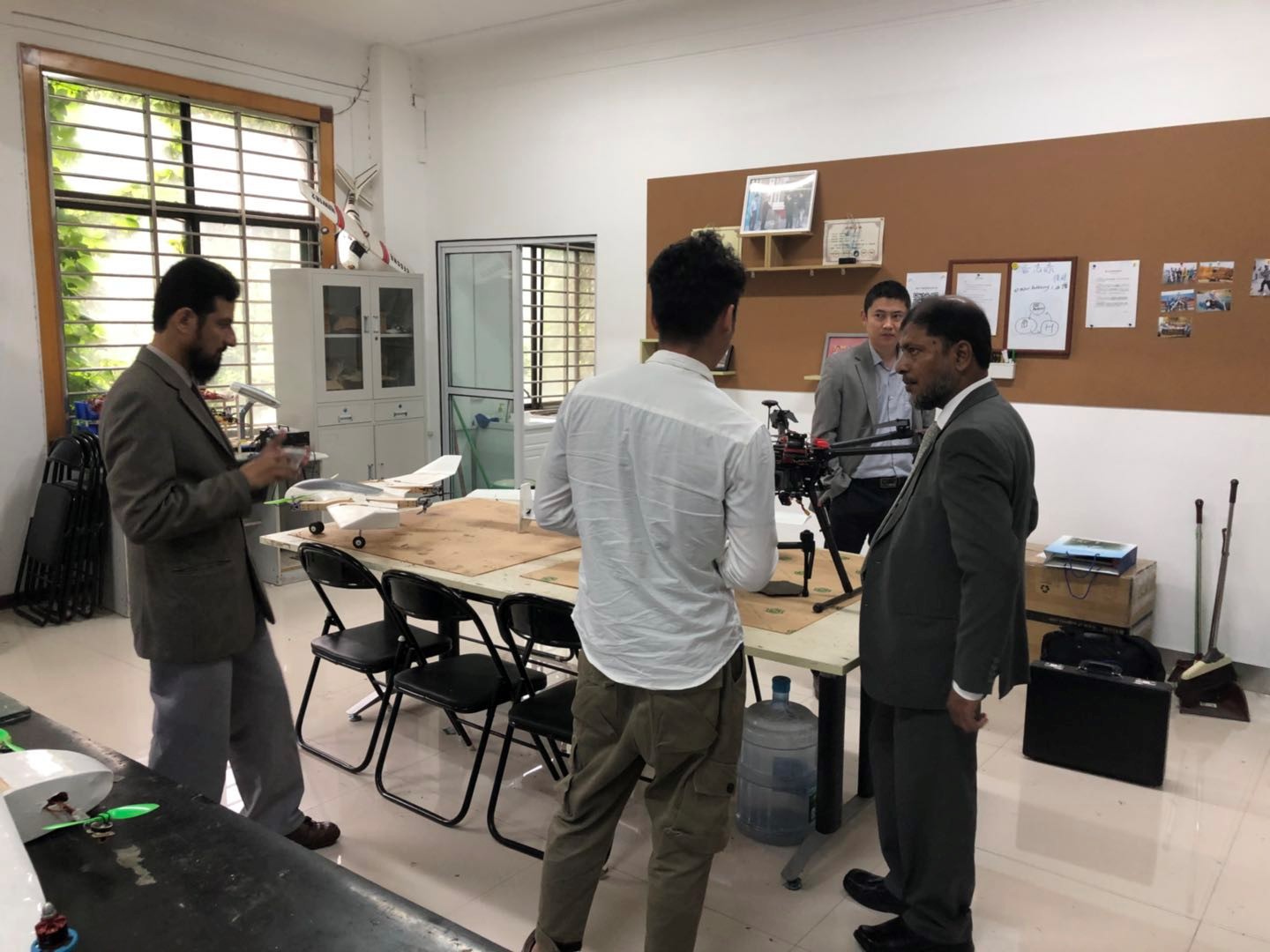 随后,温特·穆什塔克·阿哈默德等人参观了学生创新实验室及飞行器俱乐部,并与学生进行了充分交流。参观了学生作品,赞扬了学生参加竞赛取得的成绩。并对示范中心为学生打造的开放式实践环境给予充分肯定。温特·穆什塔克·阿哈默德一行还邀请飞行器俱乐部学生到巴基斯坦吉拉姆伊萨克汗工程科学技术研究所交流。