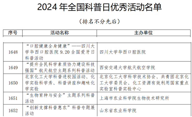 近日,中国科协办公厅发布《关于对2024年全国科普日有关组织单位和活动予以表扬的通知》,我院组织开展的“‘提升全民科学素质、协力建设科技强国’航天航空主题系列科普活动”,获评2024年全国科普日优秀活动,为全校唯一的入选项目。这一荣誉是对我院在提升全民科学素质、推动科技强国建设方面所做努力的充分肯定。