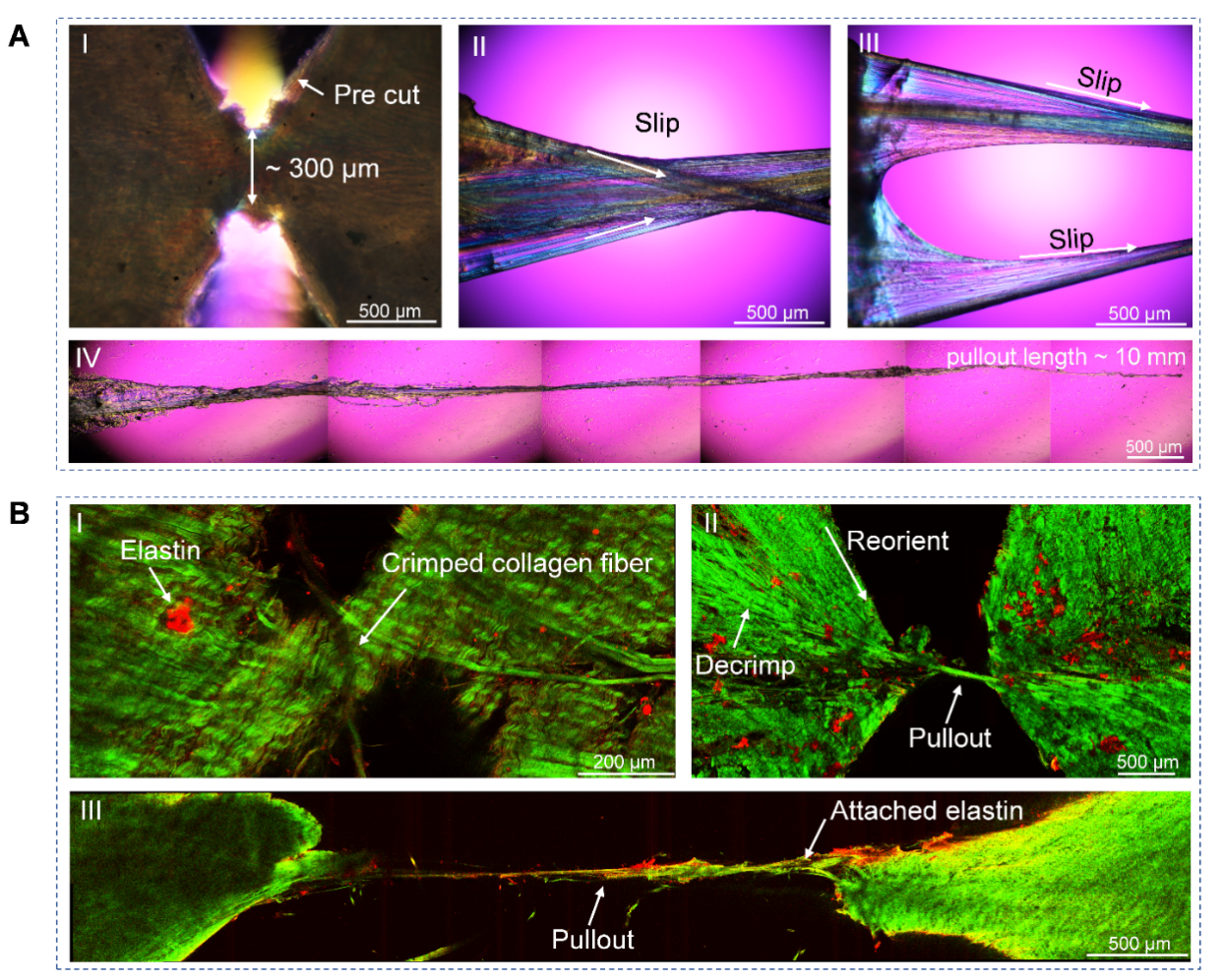 为了探明纤维抽出过程中的微观机制,研究人员使用偏振光显微镜(图4A)和双光子显微镜(图4B)记录了胶原纤维在拉伸过程中不同阶段的形貌变化。未变形时,卷曲的胶原纤维嵌入在弹性蛋白网络中。抽出过程中,胶原纤维开始解卷曲,并沿拉伸方向重新定向,胶原纤维逐步被抽出,最终约10 mm长的胶原纤维被完全抽出。