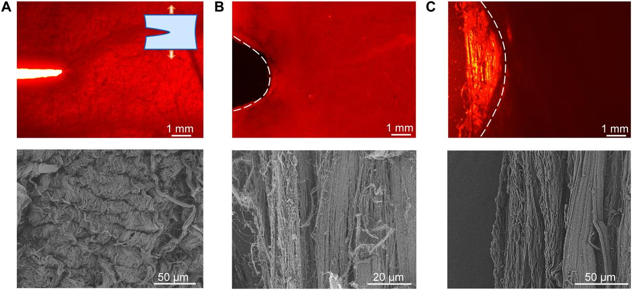 随后,研究人员基于裂纹扩展过程中能量释放率与牵引分离曲线的关系,设计“裂纹扩展实验”测量了胶原软组织的牵引分离曲线。首先观察了裂纹扩展过程中,胶原纤维在裂尖的行为和微观形貌变化。结果显示,在未变形的样品中,裂纹尖端保持完整,纤维呈卷曲状(图5A)。随着拉伸比的增加,裂纹钝化,卷曲的胶原纤维束拉直并沿拉伸方向重新取向(图5B)。随着进一步拉伸,裂纹开始在软基体中扩展,胶原纤维被拉出并桥接裂纹,在裂纹尖端形成一个明显的桥接区(图5C)。