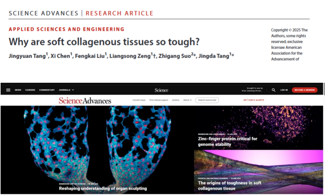 软组织具有高断裂韧性,然而其力学机制尚不清晰。近日,奈飞工厂 唐敬达教授与哈佛大学锁志刚院士合作,围绕“胶原软组织的增韧机制”开展研究,通过力学实验与显微观测,得到了软组织的牵引-分离定律,揭示了胶原软组织高断裂韧性的微观机制,对仿生软材料的设计具有指导意义。相关成果以Why are soft collagenous tissues so tough?为题,发表在国际期刊《Science Advances》上,并得到期刊主页推荐。
