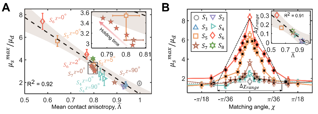 为阐明宏观摩擦响应与微观力学机制之间的跨尺度关联规律,本研究创新性地引入接触织构张量(fabric tensor)来精确量化摩擦副接触匹配水平。研究发现接触织构张量的各向异性指数可作为摩擦强度,即黏滑摩擦临界转变载荷的预测指标:摩擦副的高匹配度使得接触界面表现出更强的几何互锁与能量积累,从而增强了静动摩擦临界转变载荷。研究结果进一步表明,各向异性指数能够准确捕捉剪切过程中微接触取向分布的普适性特征。如图3所示,在界面进入完全滑动状态前,尽管经历了微滑移、弹塑性变形、材料屈服以及微接触突然断裂等一系列复杂力学现象,该指数保持相对稳定。