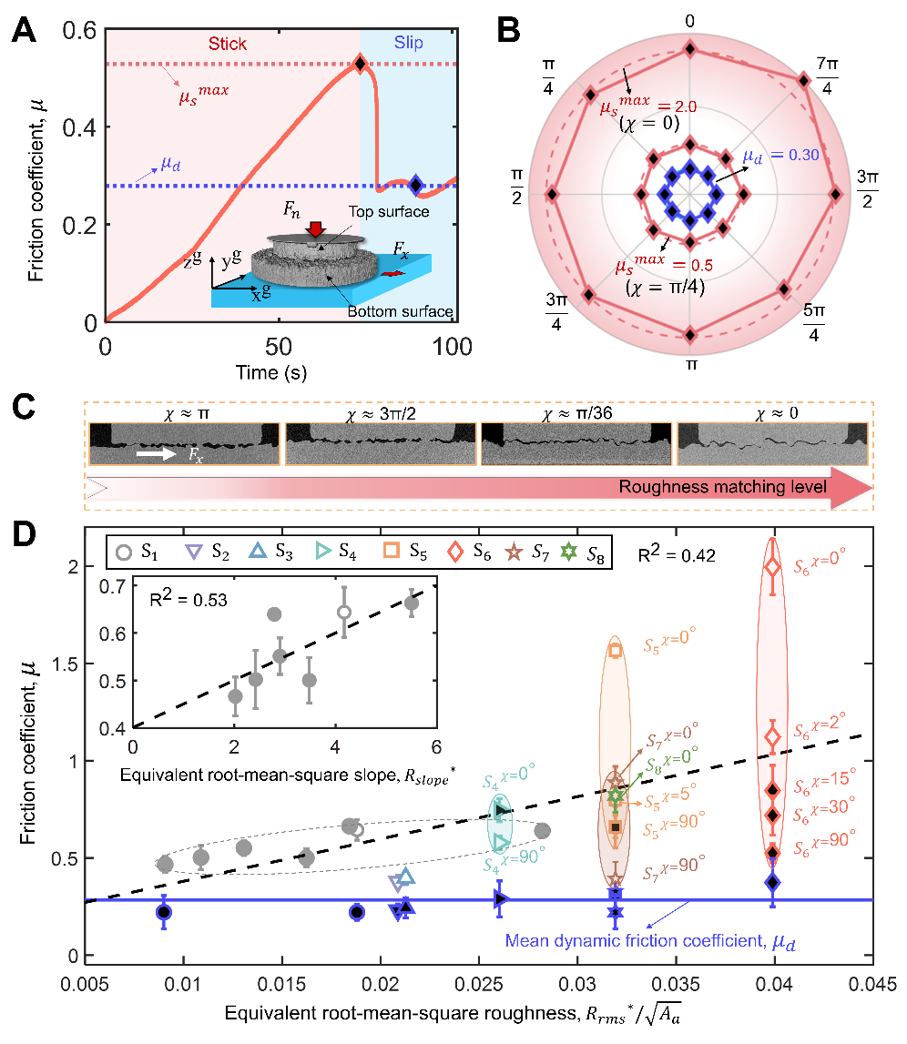 针对这一挑战,奈飞工厂 徐明龙教授团队开展了双粗糙接触界面匹配对粘滑摩擦力学特性的影响规律机理和调控机制研究。研究团队基于普遍存在的高斯型起伏和分形表面形貌特征,设计并制备了一系列具有不同粗糙度的接触面。通过旋转上表面以改变两个粗糙接触面的配准角度,从而实现摩擦副界面匹配水平的连续调节(如图1A-C)。宏观摩擦实验结果表明,当两粗糙表面达到最佳匹配时,界面静摩擦强度相较于随机粗糙-粗糙接触显著提高,最大提升近个数量级(如图1D),值得注意的是,动态摩擦系数几乎不受匹配角度变化的影响。这一发现揭示了静摩擦强度与界面几何互锁的内在关联规律,不仅为粘滑摩擦的静动摩擦临界转变载荷与形变的调控提供了实验依据,也为相关工程应用中的界面优化设计开辟了新的思路。