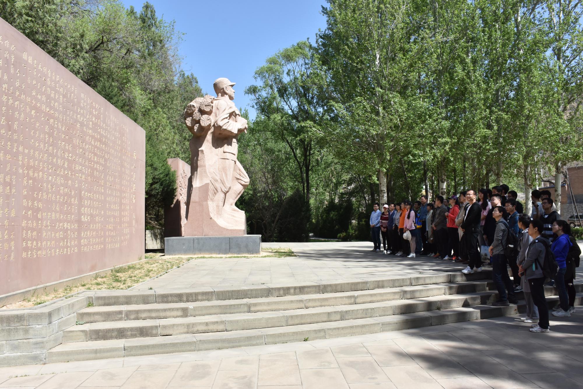 接着参观了枣园革命旧址,在枣园后沟口,当年毛主席发表《为人民服务》演讲的讲话台前,在矗立着张思德的巨型雕塑像,山壁上五个鲜红的大字,为人民服务。航天学院党委书记徐自力带领所有师生党员集体诵读毛泽东题写的《为人民服务》,“在革命战争年代,枪林弹雨中要 ‘冲得上去’,敢于牺牲;在和平建设时期,物质利益面前要 ‘守得下来’,勇于奉献。无论风雨怎样变幻,为人民服务的宗旨不能变;无论时代如何变化,为人民服务的追求不能变;无论个人得失荣辱,为人民服务的价值取向不能变”,硕士16级第二党支部高鹏飞回忆道。