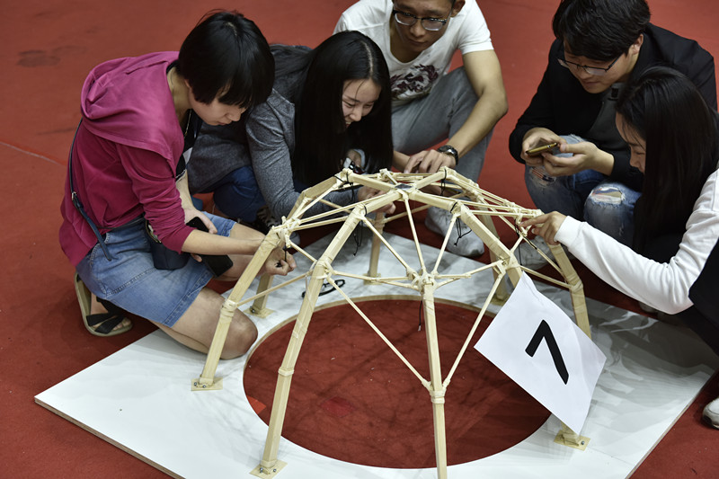 在加载环节,参赛选手将模型固定在加载台上,分三级荷载进行加载。模型单位质量的承载力越高、越能获得更高的得分。每个队伍上场时对作品设计思路作简短介绍,五位评委老师作点评、答辩,并根据结构选型外观、结构创意、现场陈述、加载表现等打分。