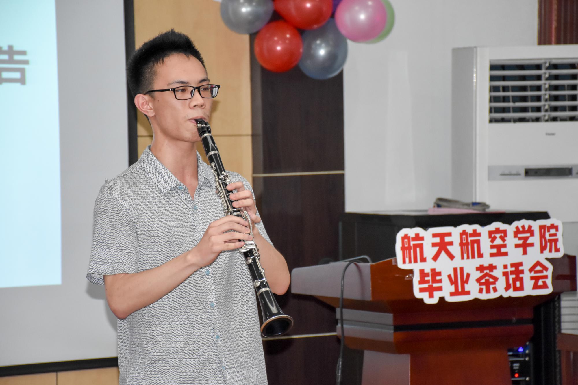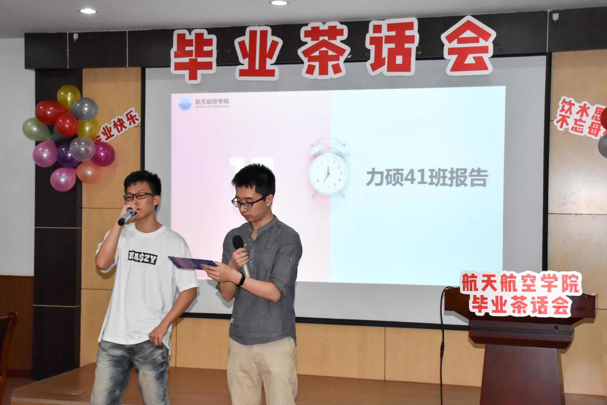 在掷地有声的誓词中,毕业茶话会正式拉开帷幕。各个面临毕业的本科生班级和硕士生班级先后上台向学院和同学们汇报在校期间班级的情况,汇报班级同学毕业后的去向,同时也为大家带来了精彩纷呈的节目。其中飞设41班的男生们合唱一曲《等你下课》,在悠扬的歌曲中,通过手举旁白的方式,展现了本科生的青春气息,体现出了现代大学生在校园中的内心独白和成长诉求,也抒发了他们对于校园深深地眷恋。硕5037班的诗朗诵表达了他们对于离别的不舍,对于校园的依恋,对于同学的情谊,同是也有对于未来的无限憧憬。乘风破浪会有时,直挂云帆济沧海。相信他们能够在未来的征途中,克服重重困难,勇往直前。