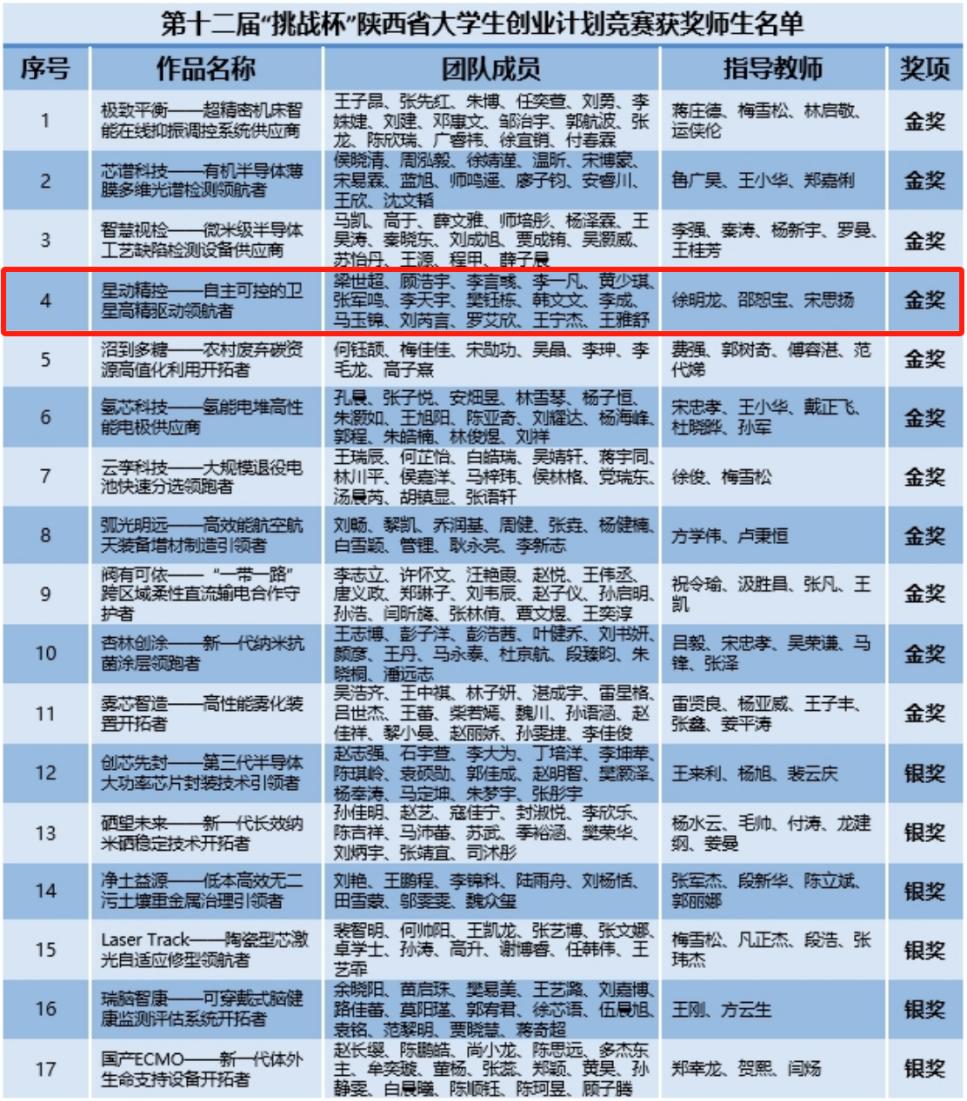 6月7日,第十二届“挑战杯”陕西省大学生创业计划竞赛闭幕式暨颁奖仪式在西北农林科技大学举行,本次竞赛由共青团陕西省委、中共陕西省委教育工委、陕西省人民政府国有资产监督管理委员会、陕西省科学技术协会、陕西省学生联合会、陕西省西咸新区开发建设管理委员会主办。我校共有17个项目入围决赛。其中,航天学院“星动精控——自主可控的卫星高精驱动领航者”斩获金奖。
