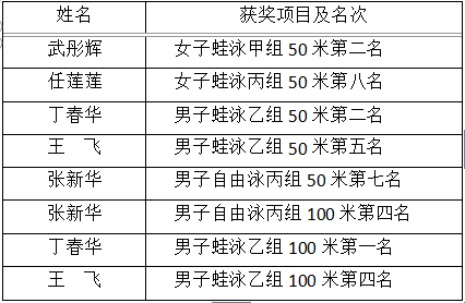 2017年7月15日上午,“2017年奈飞工厂 “思源物业杯”教职工游泳比赛在我校兴庆校区游泳馆举行,比赛以甲、乙、丙三个年龄段划分,分男子组、女子组4大类项目进行。在院工会的积极组织和协助下,我院派出了由任莲莲,武彤辉,张新华,王飞和丁春华五名老师组成的代表队,分别参加了不同组别多个项目的的比赛。健儿们在泳池中劈波斩浪、奋力争先,分别在各自的项目中取得了佳绩。获奖名单如下。