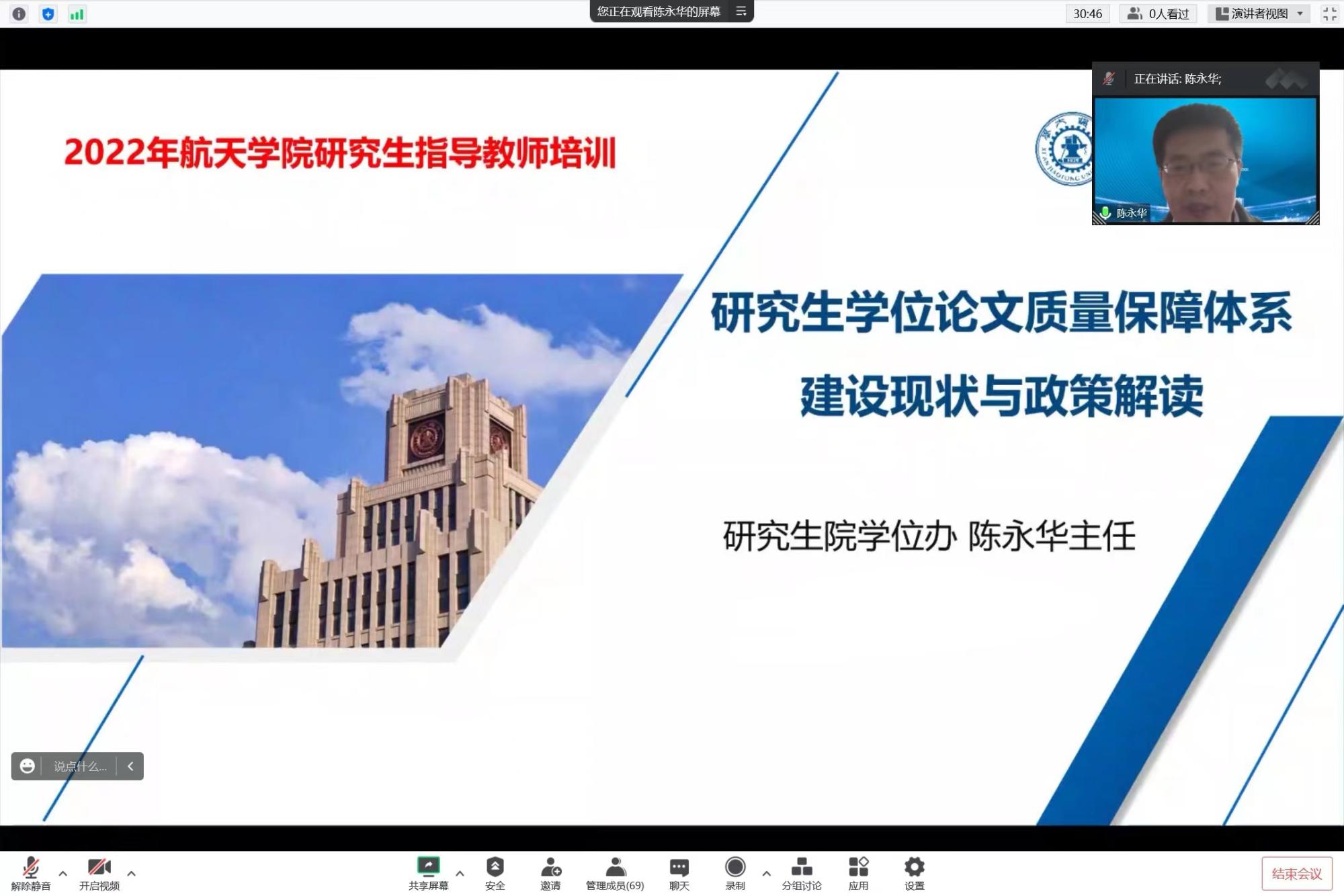 研究生学位申请指导意见》修订版解读、研究生院重要工作举措等四个方面进行了详细介绍。陈永华肯定了航天学院近几年在研究生学位论文质量保障方面的工作,希望在广大师生的共同努力下,把学院研究生培养质量提上新台阶。