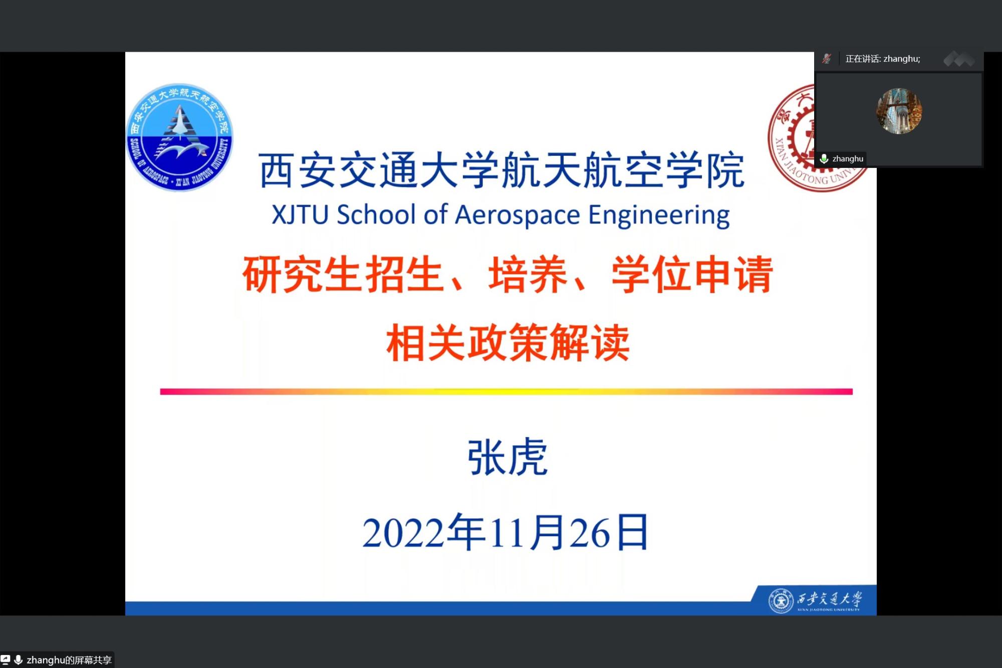 接着,院长助理张虎就航天学院研究生招生、培养、学位申请相关政策进行解读。张虎详细介绍了研究生导师资格遴选、招生指标分配、培养方案和培养过程重要环节、学位申请细则、留学生培养等内容,强调研究生培养质量与导师密切相关,对青年导师尤为重要,希望广大导师高度重视,为学院研究生培养高质量发展做出应有贡献。