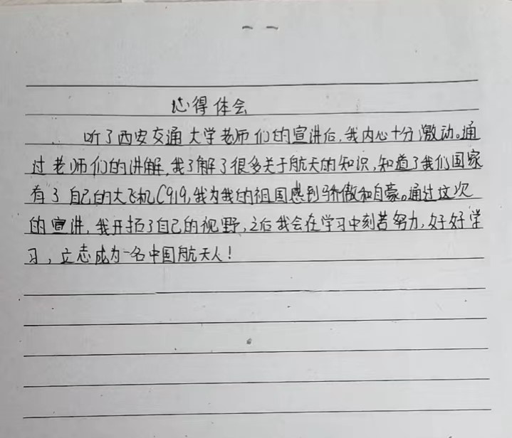 老师们的宣讲,他了解了很多关于航天的知识,知道了我们国家有了自己的大飞机C919,他为祖国感到骄傲和自傲,并表示将会在未来的学习中刻苦努力,好好学习!立志成为一名中国航天人!