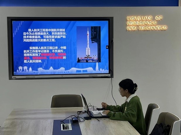 白金做了航天知识的科普及“载人航天精神”宣讲。她结合自身学科专业知识,从载人航天工程、探月工程、空间站工程及大飞机C919工程几个方面为中学生们科普航空航天知识,带领同学们了解我国空天事业的发展历程及现状,了解C919大飞机工程中的交大力量。她讲到,20多年来,虽然存在来自国外的长期技术封锁,但我国载人航天事业依旧逆风起飞,这其中离不开的便是“特别能吃苦、特别能战斗、特别能攻关、特别能奉献”的载人航天精神。白金同学的讲述激发了中学生们热爱祖国、崇尚科学、探索未知的热情,拓宽了他们的视野,中学生们纷纷表示自己希望能够考入交大航天学院,未来成为一名真正的航天人。