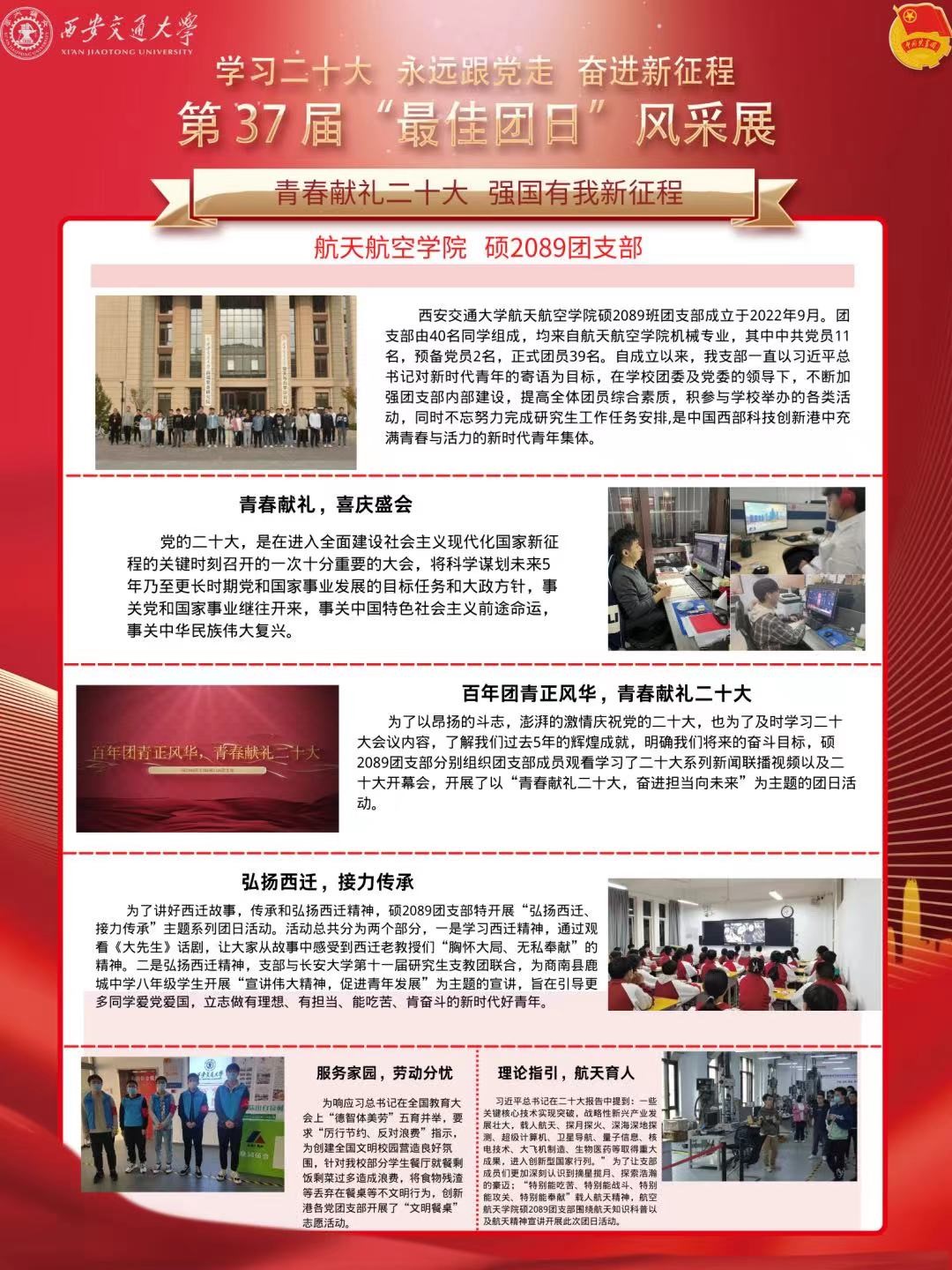 自学校“最佳团日”活动启动以来,硕2089团支部以“青春献礼二十大,强国有我新征程”为主题,从思想、行动、未来三条主线展开小专题活动。在“青春献礼,喜庆盛会”活动中,支部全体成员观看学习二十大会议内容,并开展了宣誓活动,表达了航天学子对祖国的美好祝愿。在“弘扬西迁,接力传承”活动中,支部成员通过观看学习大先生系列话剧,学习感受西迁老教授们“胸怀大局、无私奉献”的精神。支部还联合长安大学研究生支教团为商南县鹿城中学八年级学生开展西迁精神与载人航天精神宣讲,让西迁精神走入更多人的视野,引导更多同学立志做有理想、有担当、能吃苦、肯奋斗的新时代好青年。除了理论学习之外,支部成员还积极践行志愿精神,通过 “光盘行动打卡”、“打扫阳光书屋“、“文明餐桌”等志愿活动,为同学们老师们办实事,共同建设美丽新港。除以上活动外,支部还与马克思主义学院、新媒体学院、法学院等不同学院联合举办多项活动,包括“重温经典,你我传承”“国之重器,筑梦航天”“理论指引,航天育人”“法力交流,融合发展”等系列活动。