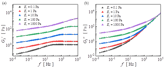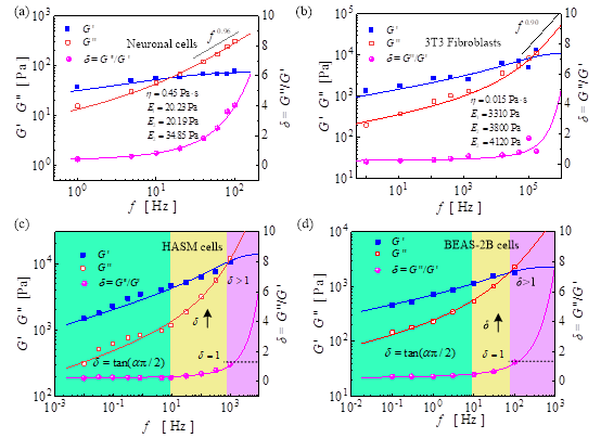 细胞是一种活性软材料,表现出兼具固体弹性和流体粘性的力学特性。诸多实验表明,在10-2- 102Hz的低频范围内,细胞的复模量是关于频率的弱幂律形式,此时,储能模量和耗能模量的标度律指数近似,都集中在0.1 ~ 0.3范围内。然而,随着频率的进一步增加,细胞的复模量与频率之间的弱幂律关系被打破,耗能模量对频率的依赖高于储能模量。目前,关于细胞的粘弹性力学响应的研究主要考虑其在阶跃应力下的蠕变响应、阶跃应变作用下的松弛响应以及其在低频情况下的复模量变化,针对细胞高频下的粘弹性力学响应研究较少。此外,细胞在低频和高频下粘弹性力学响应的差异以及其潜在的形成机制尚不清楚。