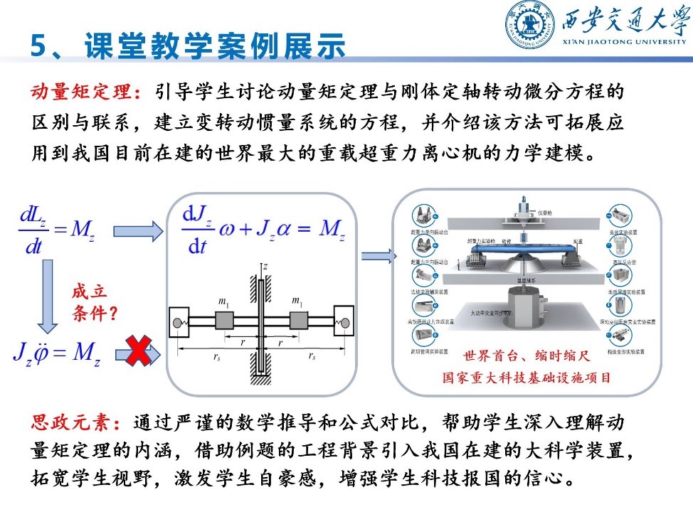 航天学院张亚红老师的《理论力学》课程荣获一等奖。该课程以教学内容有广度、讨论问题有深度,课堂交流有温度为指导思想,使课堂教学集能力提升和情感素质培养于一体。在教学案例设计方面,理论联系实际,突出科教融合,体现课程在现代技术领域与前沿研究中的强大生命力。譬如,动力学部分将动量矩定理拓展应用到我国目前在建的世界最大的重载超重力离心机的力学建模,借助例题的工程背景引入我国在建的大科学装置,拓宽学生视野,激发学生自豪感,增强学生科技报国的信心。