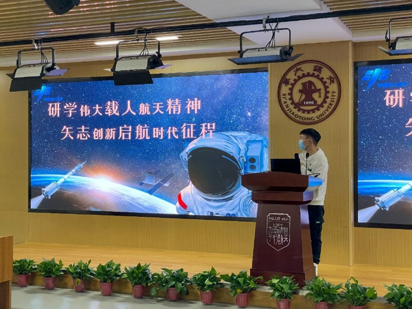 正值“中国航天日”前夕,熊峰同学带领大家回顾了中国航天史的发展,学习领会特别能吃苦、特别能战斗、特别能攻关、特别能奉献的载人航天精神内涵。同时聚焦神州十三号凯旋的重要时刻与中国载人航天的伟大成就,呼吁航院学子积极投身科研、开启航天新征程。