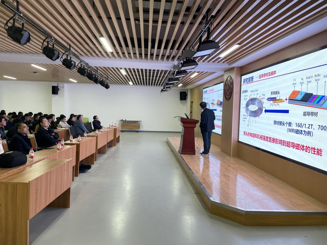 报告会伊始,申胜平院长向大家介绍了周又和院士的研究方向及其在学术上的突出贡献。随后,周又和院士从“力致”与“失超”的含义阐释讲起,分享了他所带团队在力致失超理论和实验研究途径方面的最新研究成果,重点介绍了超导材料及磁体在极端使役环境下的电-磁-热-力多场相互作用所导致的非线性力学变形、变形对超导性能退化影响的机制、对磁场特性的影响因素和“失超”的应变检测新途径等所开展的理论建模与定量分析方法、基础实验测量研究、全背景场力学实验测量的科学装置研制和新型超导材料开发制备等。