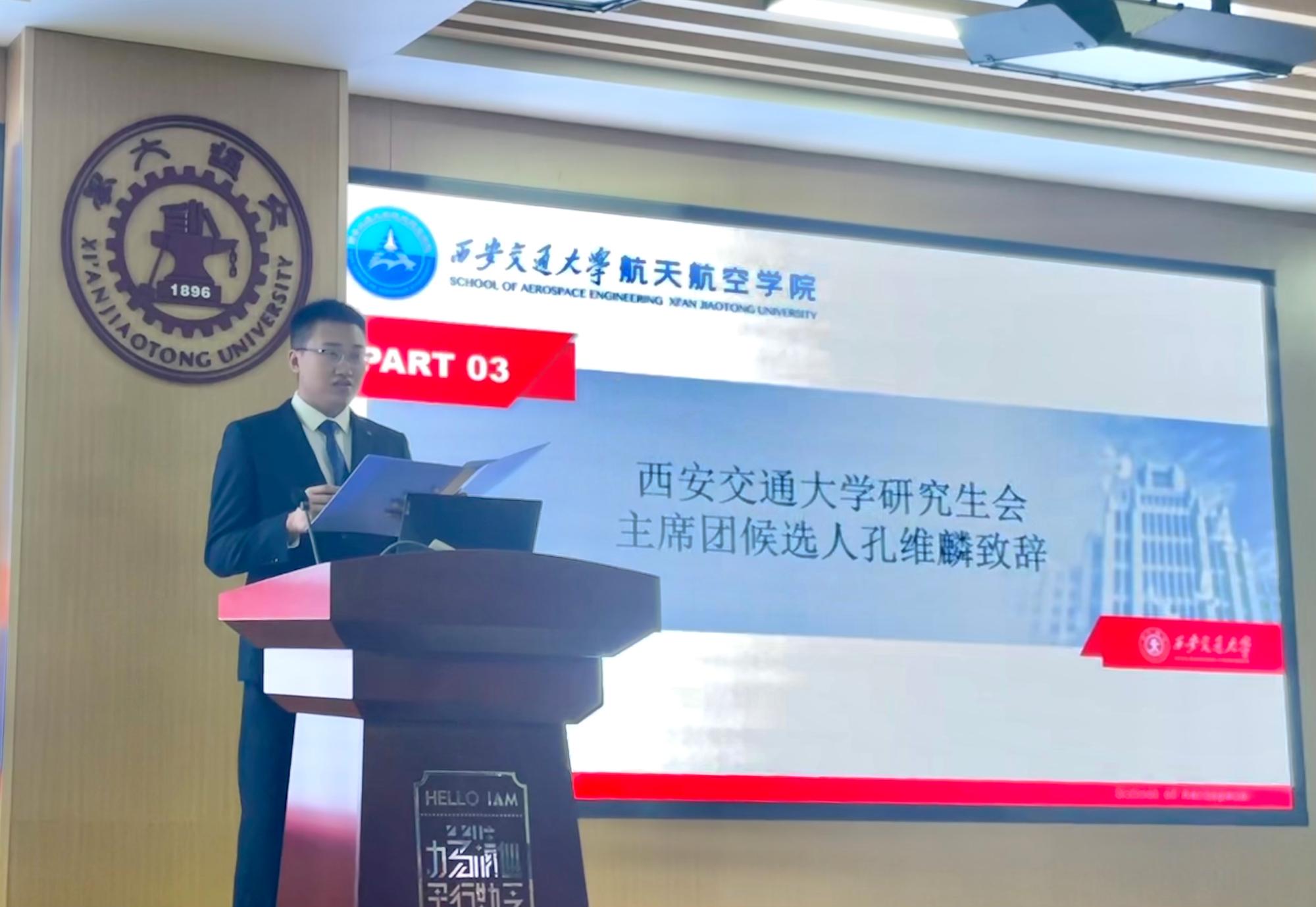 校研究生会主席团候选人孔维麟代表校研究生会希望航天学院研究生会做到以下三点:一是加强思想政治引领,贯彻落实习近平新时代中国特色社会主义思想,增强“四个意识”、坚定“四个自信”、做到“两个维护”,传承弘扬西迁精神,厚植家国情怀;二是全心全意服务同学,切实发挥学校学院和广大同学之间的桥梁纽带作用;三是持续推进组织建设,切实增强研会成员的政治性、先进性、群众性。