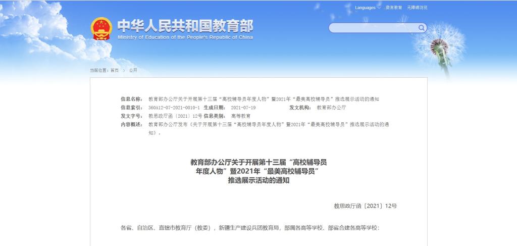 第十三届“全国高校辅导员年度人物”评选由教育部思想政治工作司指导,中国高教学会辅导员工作研究会主办,于2021年7月启动,旨在着力打造高素质思想政治工作队伍,充分发挥先进榜样的引领带动作用,引导广大辅导员不忘初心、牢记使命。经组织推荐、材料审核、现场答辩等环节,本次最终评选出2021年“最美高校辅导员”10人、第十三届“全国高校辅导员年度人物”20名、第十三届“全国高校辅导员年度人物”年度人物提名奖30名。