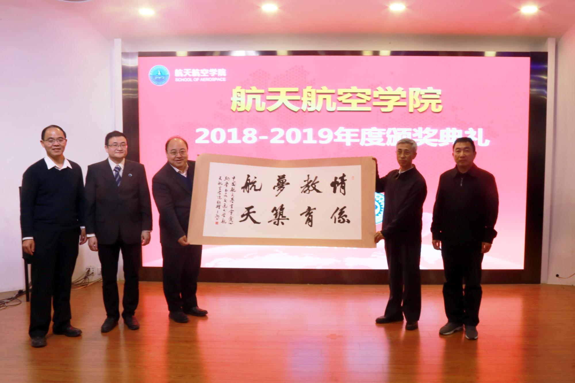 校党委副书记宫辉、航天学院院长申胜平、院党委书记徐自力共同为中国航天基金赠送牌匾,并与张声远将军、吴杰部长合影留念。