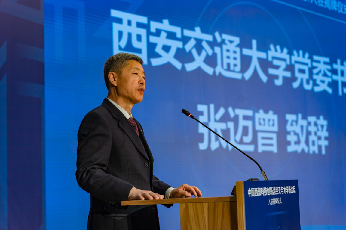 张迈曾书记致辞,他首先代表学校向与会院士、领导、专家、学者们助力西部科技创新港建设,出席此次空天与力学研究院揭牌成立仪式表示诚挚的谢意。张书记指出,空天与力学研究院进驻创新港为进驻搬迁工作画上了完美“分号”,未来要继续推进研究院的建设,在最短时间内搭建开展科研的坚实平台,在此基础上设计新的科研体制机制。张书记讲到,“士不可以不弘毅,任重而道远”,希望空天与力学研究院全体师生坚持践行当代知识分子的使命责任,勇担民族复兴大任,夯实学科发展、团队建设的坚实基础,以更开放的思维和胸怀,迈开脚步,寻求合作,争取更多社会资源支持,为国家发展做出更大贡献。