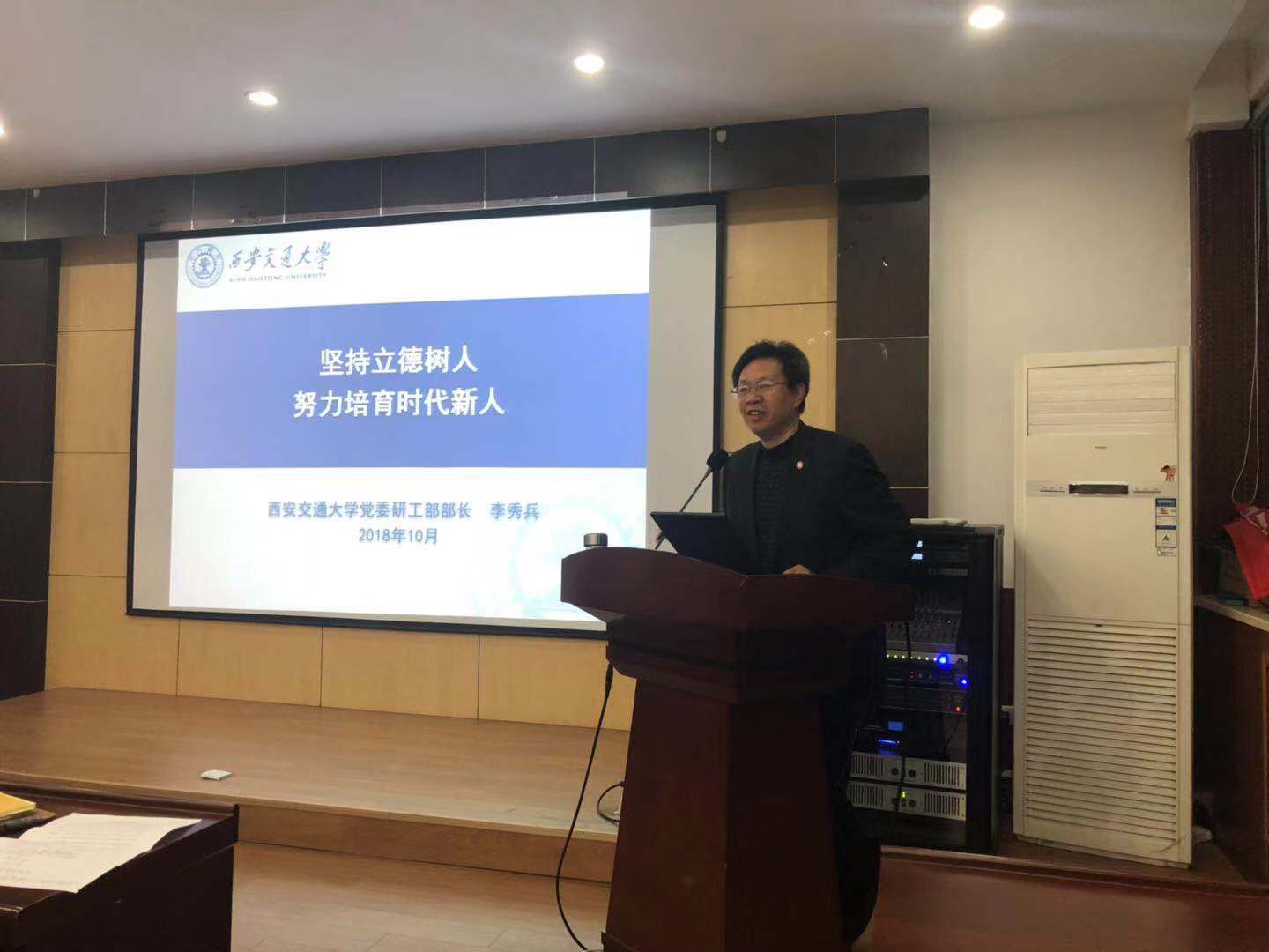 2018年10月25日,为了践行爱国奋斗精神,提升研究生党支部人才培养质量,培育新时代人才,助力“双一流”建设。航天学院邀请党委研工部部长、研究生院李秀兵副院长在第五会议室为全体研究生党员做了题为“坚持立德树人,努力培育时代新人”的报告。会议由奈飞工厂