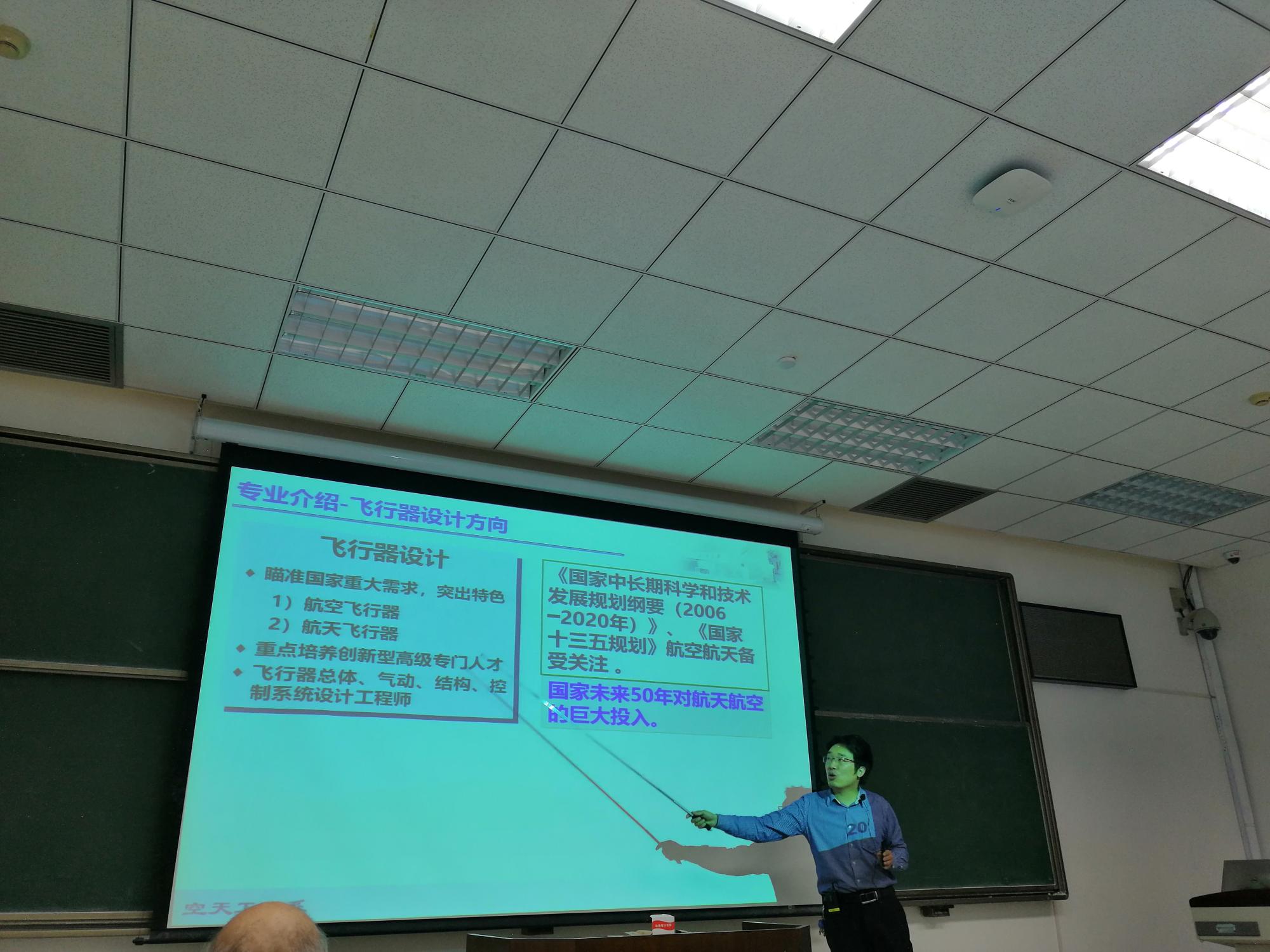 空天工程系刘振主任以“宇宙”、“梦想”二字展开,向同学们做了精彩报告。阐述了飞行器设计与工程专业的专业背景、课程设置、就业前景等,并通过解答三个问题“飞行器为什么会飞?”、“飞行器为什么会这样飞?”、“飞行器为什么飞不坏?”向同学们详细介绍了飞行器设计专业的学习内容。并欢迎大家报考飞行器设计与工程专业,共同探索宇宙,为人类服务。