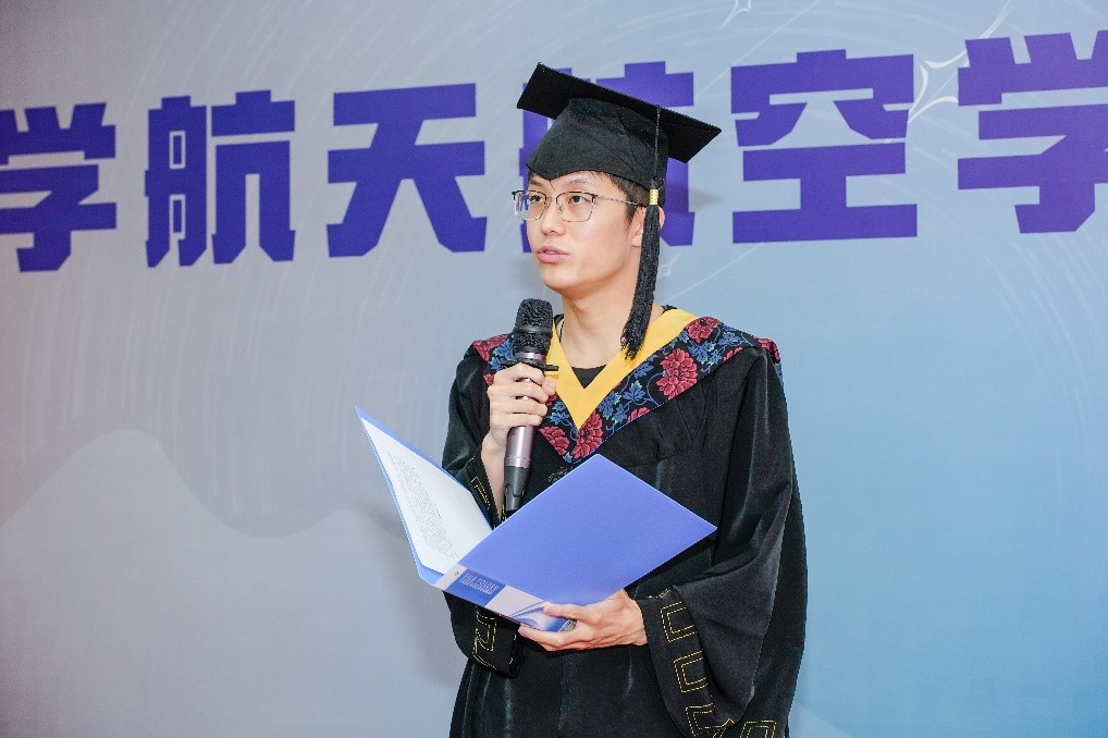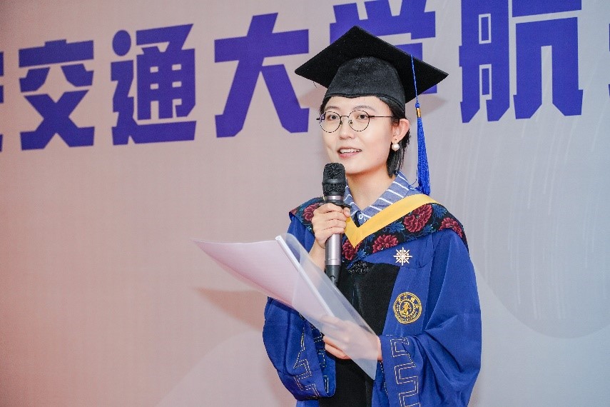 大学优秀毕业生硕0093班贾烨彤同学代表2023届研究生毕业生发言。她分享了自己在交大读书的感悟,谈到交大和航院提供了一片肥沃的土壤,让自己和同学们一起由青涩的小苗成长为可以在某一领域撑起一片阴凉的小树,感谢学院和导师提供的浓郁学习氛围和一流科研平台,让自己有机会探索感兴趣的研究方向。