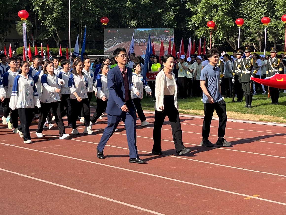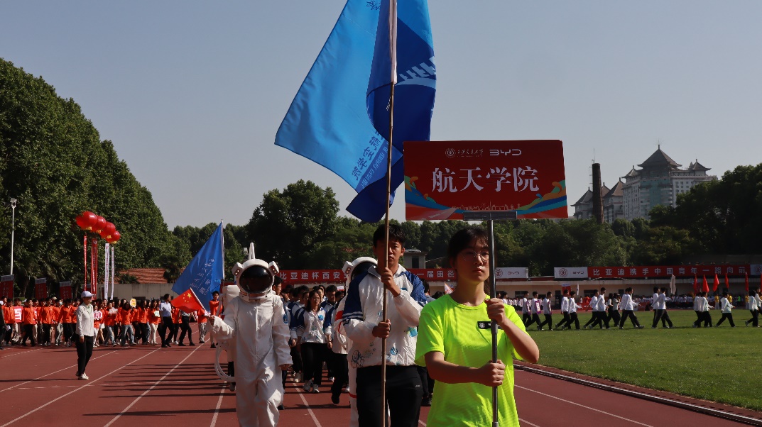 运动会开幕式上,在党委副书记李昱静、院长助理张虎、研究生辅导员李宇辰的带领下,航天学院方阵走过主席台,队形整齐、口号响亮,航天员人偶彰显航天特色。