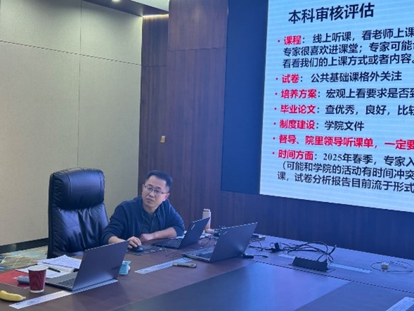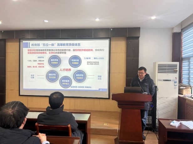 刘益伦副院长就本科教育教学审核评估做了专题报告。他首先向老师们介绍了新一轮审核评估工作基本情况,详细讲解了审核评估工作有关工作流程,就教育部“五位一体”高质量教育质保体系做了分享,阐述了OBE教育理念及我校实践情况,就我校本科教学质量保障体系建设情况、本科人才培养特色做法及成效做了说明。刘益伦向老师们通报了本年度教学工作完成情况,教育教学综合改革和创新性举措成效,对本年度教学工作业绩进行了总结。