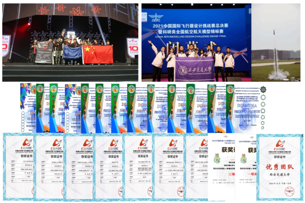 激发创新思维潜能,培育卓越科研英才。学院着力培养学生创新思维,搭建了“开放实验—大创项目—科研训练—创新竞赛”的贯通式创新实践育人平台,有效激发学生的内在动力。通过组建创新创业实践导师团队,将经典的大学生创新实践项目、竞赛内容与高质量的科研训练相结合,创新性地开设了实践类通识课程。学院鼓励学生根据兴趣组建团队,参与大学生创新实践项目和科研训练,并以团队形式参加创新竞赛,逐步培养学生的科研能力,深化其科学研究实践。自2018年以来,学院学生获批省部级以上大学生创新实践项目112项,荣获互联网+大学生创新创业大赛金奖4项,“挑战杯”中国大学生创业计划竞赛金奖,获得中国首个VEX机器人世锦赛全能总冠军、SAE飞行器设计挑战赛世界总冠军、全国大学生机器人大赛一等奖、中国研究生未来飞行器创新大赛一等奖、全国周培源大学生力学竞赛一等奖等学科、科技竞赛奖励890余人次,在各类竞赛中斩获佳绩,展现了卓越的创新能力和科研潜力。