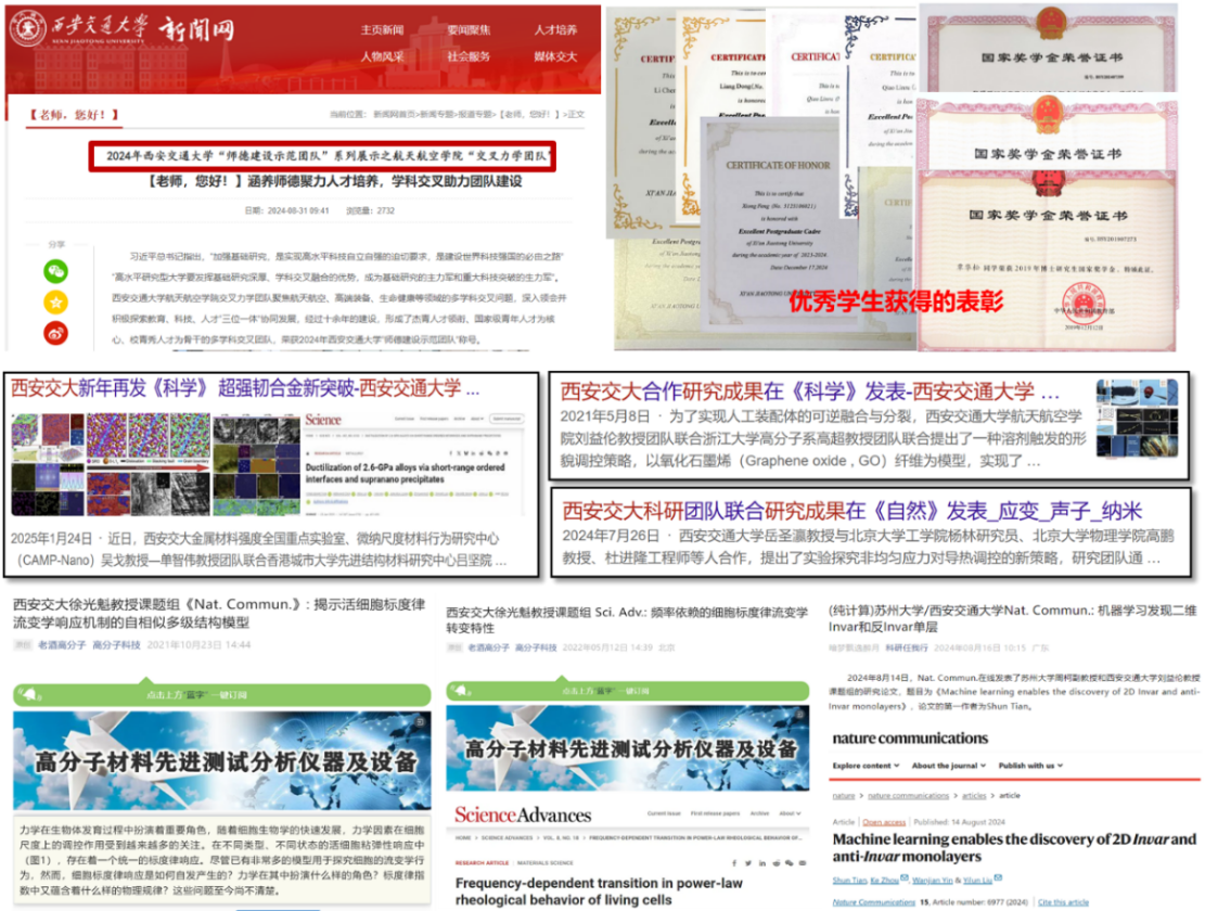 以兴趣为牵引激活内生动力,矢志培养拔尖创新人才,是交叉力学团队的创新基因与使命追求。团队积极推进有组织科学研究,以重大科研攻关项目为育人载体,构建起“价值引领、基础强化、创新驱动、个性发展”的特色人才培养体系。截至目前,团队已指导培养研究生100余人次,培养成果丰硕:众多研究生、博士生荣获国家奖学金、教育部博士研究生学术新人奖等重要荣誉;3篇博士学位论文获评“陕西省优秀博士学位论文”;2人获中国力学学会毕业设计A类优秀论文;3人获评“奈飞工厂