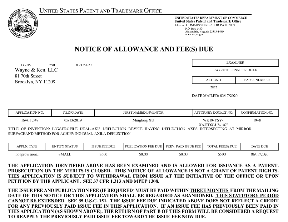 2020年3月17日,我院徐明龙教授团队收到了来自美国专利和商标局的专利授权通知书,获得了名为“LOW-PROFILE DUAL-AXIS DEFLECTION DEVICE HAVING DEFLECTION AXES INTERSECTING AT MIRROR SURFACE AND METHOD FOR ACHIEVING DUAL-AXILA DEFLECTION”发明专利的授权,是我院的第一项美国专利。徐明龙教授为该发明专利的第一发明人,发明人还包括了学院在读博士宋思扬及学院田征、冯勃、邵恕宝三位老师。