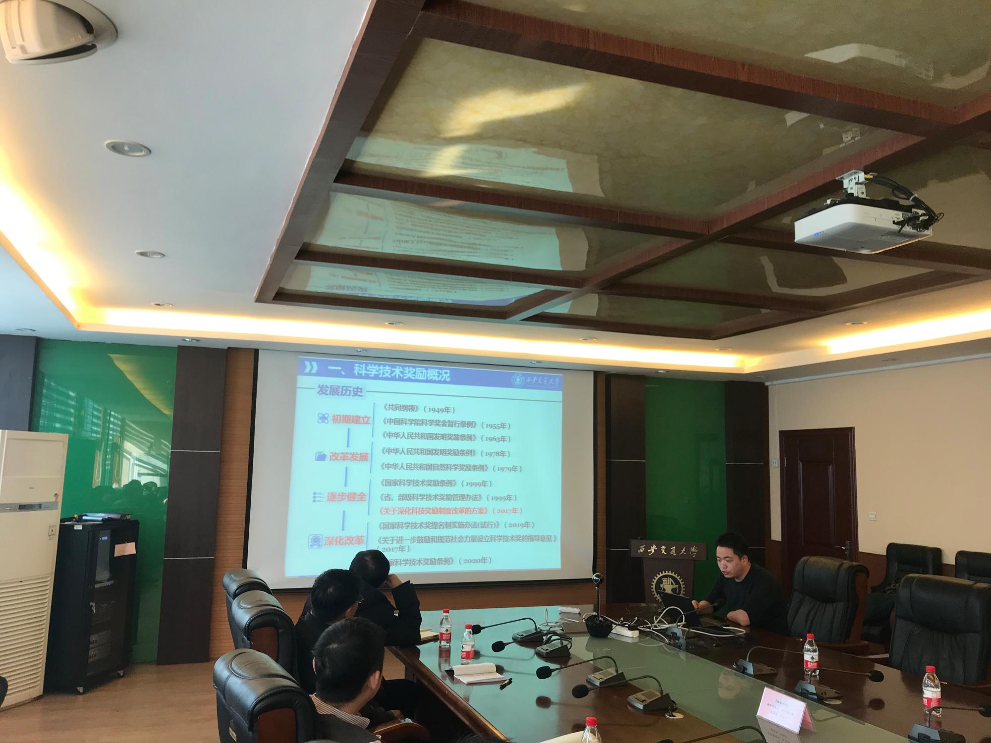还是大有潜力可挖,鼓励大家敢于申报,积极参与军工项目。基地与成果处刘兴华老师先就科学技术奖励做了简单的概述,通过对奖励申报注意事项和撰写申报材料技巧两个方面具体案例的讲述,以及学校对申报奖项的管理服务情况介绍,使与会教师对国家、教育部、省级及其他各类奖项的申报、撰写等有了明晰的了解。会议期间,科研院的领导和老师还耐心细致的回答了与会教师的提问,并展开了热烈的讨论。