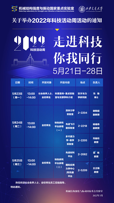 按照国务院规定,每年五月举办科技活动周。为全面贯彻党的十九大精神,深入实施创新驱动发展战略,科技部、中央宣传部、中国科协将共同主办2022年全国科技活动周。机械结构强度与振动国家重点实验室响应科技部号召,决定于5月21日至28日举办科技活动周,以“走进科技 你我同行”为主题,开展多种形式的开放和科技宣传活动,具体安排如下: